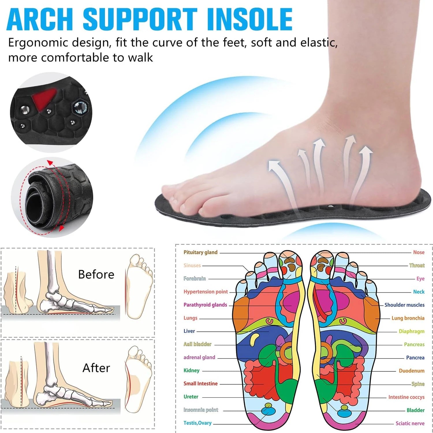 Тези стелки помагат за намаляване на удара, поддържат сводовете и облекчават умората от стоене или ходене. Геловият слой омекотява всяка стъпка, докато масажната текстура стимулира кръвообращението и осигурява освежаващо усещане от сутрин до вечер. Идеални за активен начин на живот, работа на твърди повърхности или дълги пътувания — краката ви остават комфортни, за да се движите с увереност.