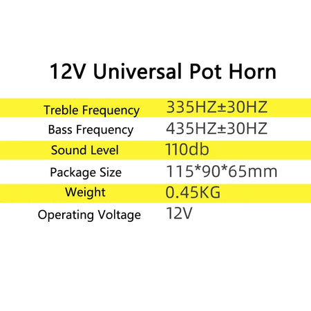 Подобрете безопасността на пътя с универсалния 12V електрически клаксон, високовидим водоустойчив говорител с 110dB, проектиран за универсална употреба в превозни средства. Изработен от издръжлив ABS, този двутонален клаксон излъчва ясен, привличащ вниманието сигнал при всякакви метеорологични условия, осигурявайки вашето присъствие да бъде забелязано от близките шофьори. С 12V съвместимост и универсално прилягане, той е практична замяна или ъпгрейд за автомобили, камиони и SUV.