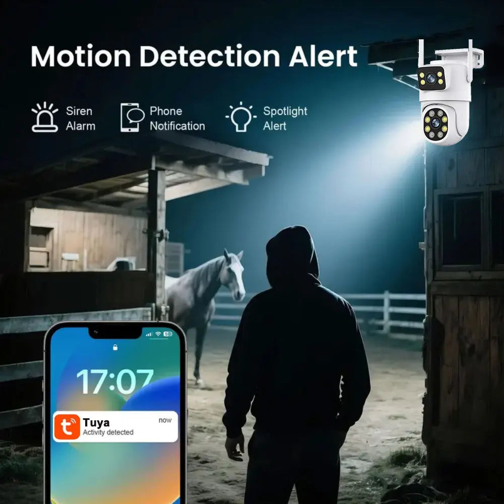 Съвместима с Alexa и Google Home, тази камера се интегрира безпроблемно във вашата интелигентна домашна система без допълнителни разходи. Изпитайте спокойствие с нашата 12-месечна гаранция и посветена клиентска поддръжка. Осигурете сигурността на имота си с усъвършенстваната 10MP Dual Lens Tuya Wifi Camera днес!