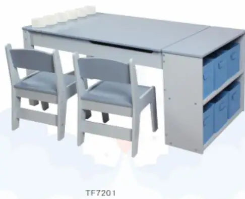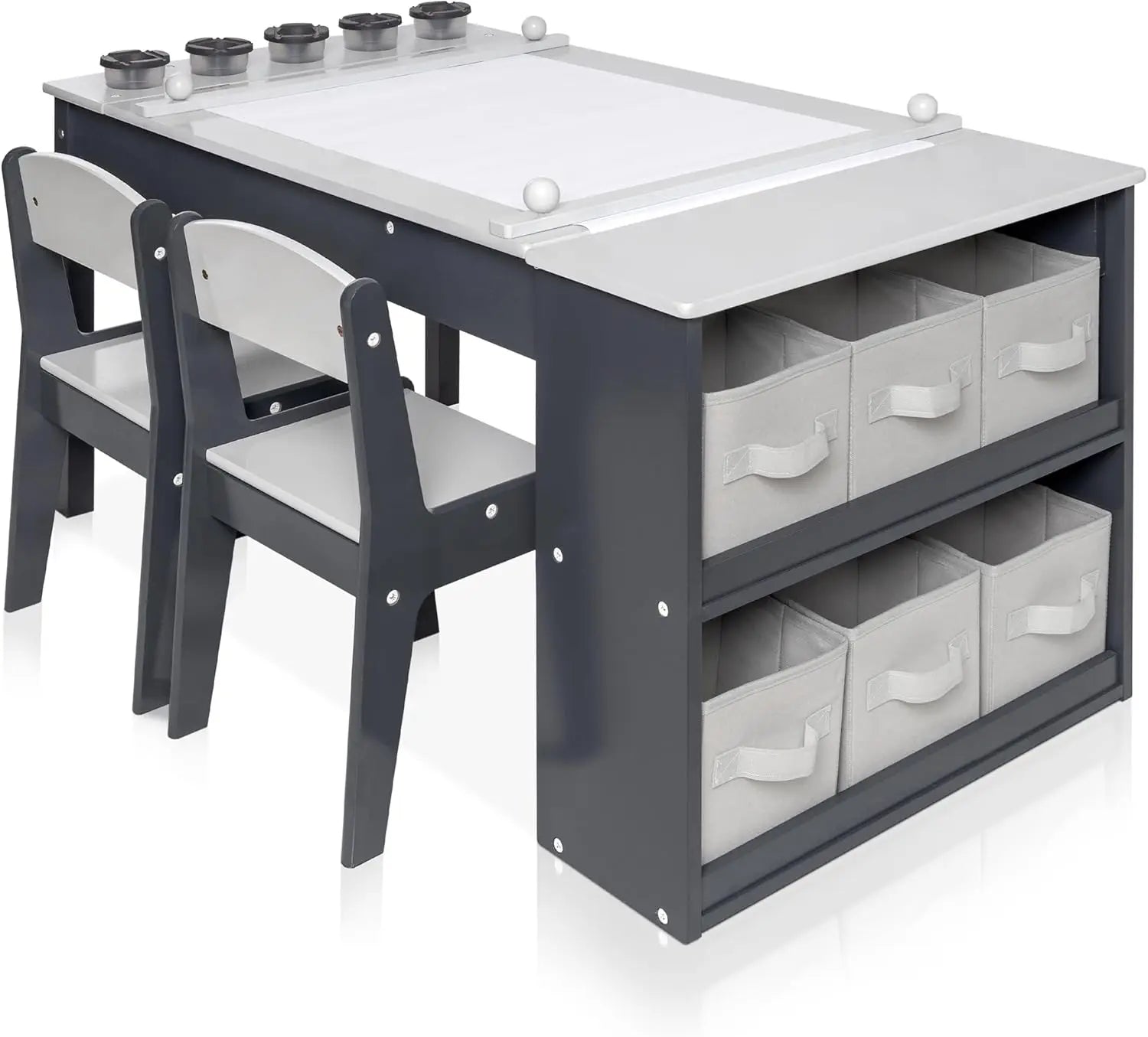 - Вградено съхранение под масата плюс шест кутии за съхранение поддържат материалите организирани и лесно достъпни, като учат децата на навици за подреденост.