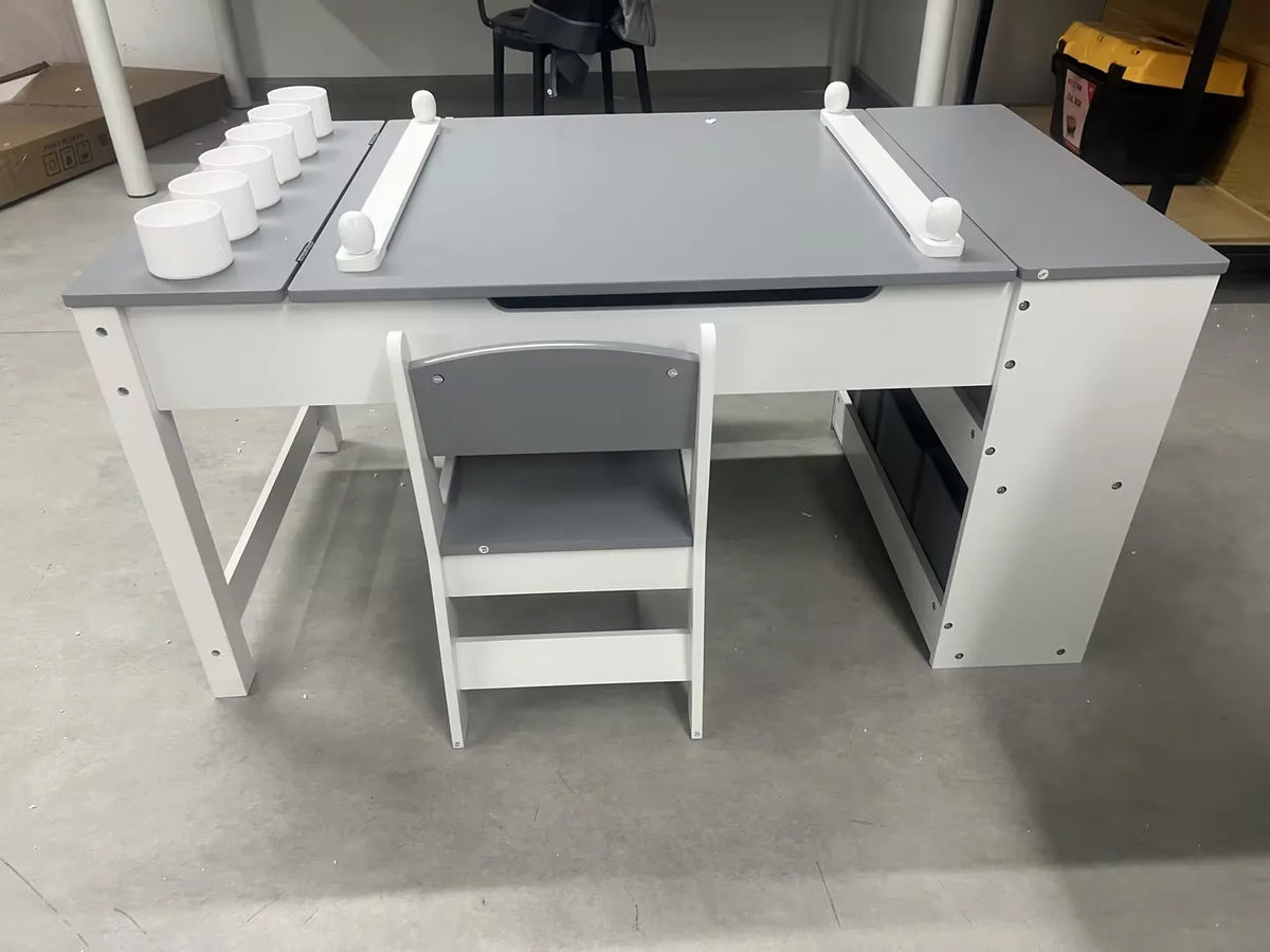 Детският комплект маса и стол с двоен дизайн и място за съхранение на статив е универсално, удобно за деца работно място, създадено да расте заедно с младите художници. Плотът лесно се превръща в статив за рисуване, боядисване и занаяти, след което се връща обратно в функционална арт маса за домашни, пъзели или време за закуска. Тази безпроблемна трансформация ангажира малките ръчички, стимулира въображението и намалява бъркотията, като осигурява специално място за творчество в един стилен комплект.