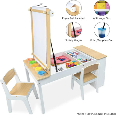 Изработен с модерен бял и естествен дървесен дизайн, комплектът пасва на съвременни интериори, като дава на децата специално, привлекателно място за творчество. Повърхността има устойчива на надраскване и петна обработка за бързо почистване след натоварени арт сесии, а съхранението под масата помага да се държат пастели, лепило, четки и хартия подредени и на разположение. С пет чаши за боя, шест кутии за съхранение и предварително монтиран ролка за хартия на мольберт, вашето дете може да започне творене веднага щом комплектът пристигне.