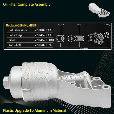- OEM номера: Асамблея на маслен филтър — 26300-3LAA0, 263003LAA0; Уплътнителен пръстен — 26345-3LAA0, 263453LAA0; Филтър — 26345-3CKB0, 263453CKB0; Горна обвивка — 26350-3C701, 263503C701
