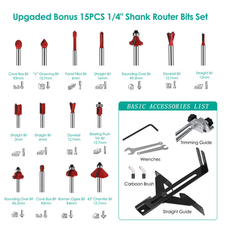 - Универсален комплект за подрязване: 15 фрези покриват разнообразие от разрези и дизайни — прорязване, арково подрязване и художествено гравиране — перфектни за проекти „направи си сам“ или професионална работа.