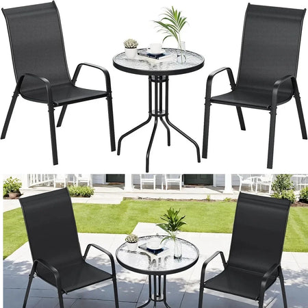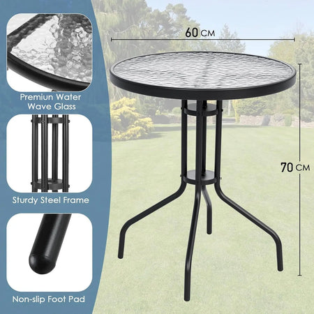 Проектиран за лесна поддръжка и дълготрайна употреба, плотът от закалено стъкло осигурява стабилна повърхност за напитки и закуски, докато сгъваемите столове спестяват ценно място, когато не приемате гости. Всеки стол поддържа до 150 кг, а масата до 50 кг, с подсилена метална конструкция и нехлъзгащи се капачки на краката за допълнителна стабилност. Компактните размери и вечният черен завършек гарантират, че комплектът се вписва елегантно в тесни ъгли без да жертва стил.