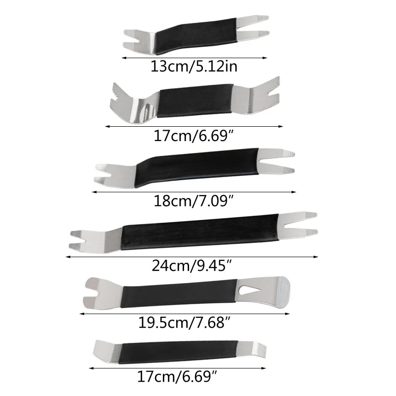 Комплект инструменти за премахване на клипове за врати и обшивки за автомобилни табла с шест части е компактен, преносим комплект инструменти, проектиран да ви помогне да премахнете клиповете за врати и обшивките от автомобилните табла. Шестчастният комплект е идеален за поддръжка на интериора с "направи си сам" и бързи обшивки на метални повърхности, предоставяйки практично решение за поддръжка, ремонти и подобрения в автомобила ви.