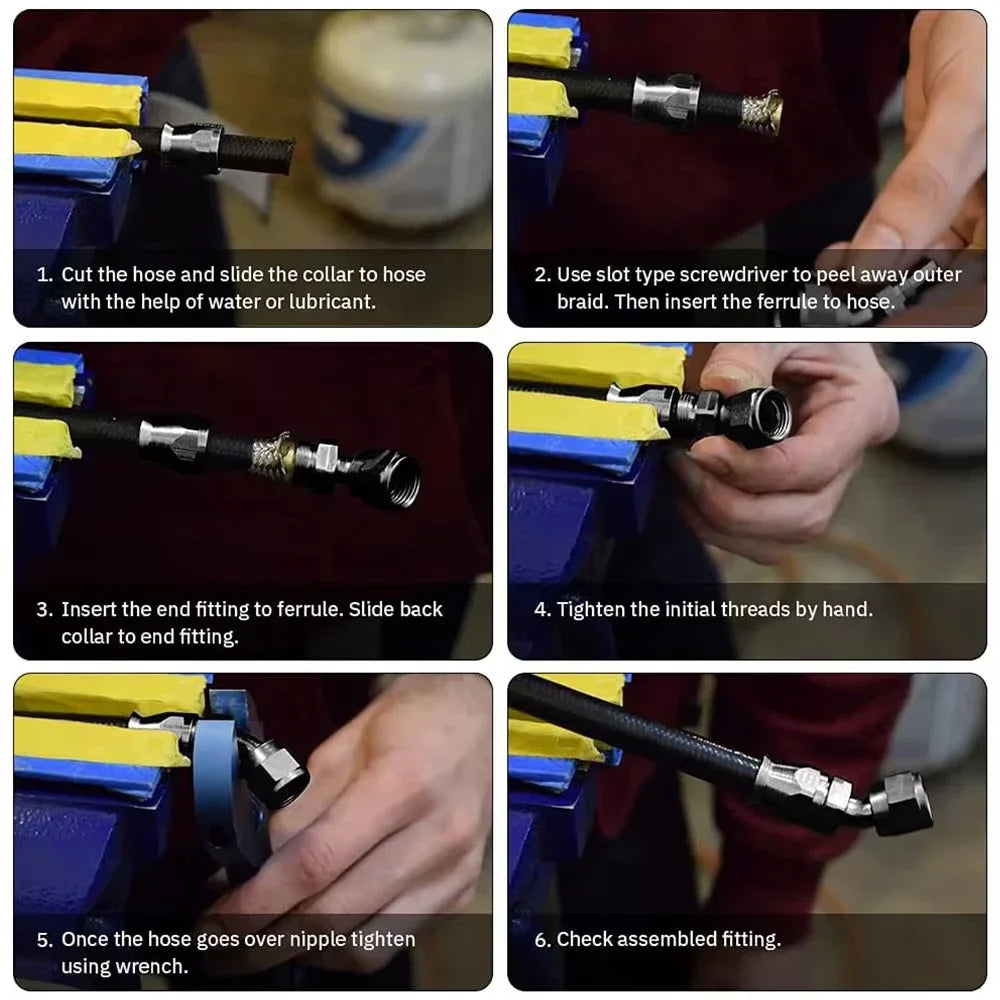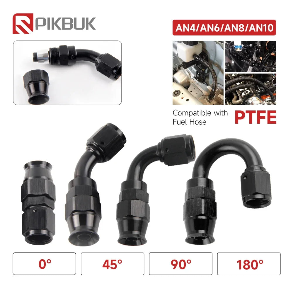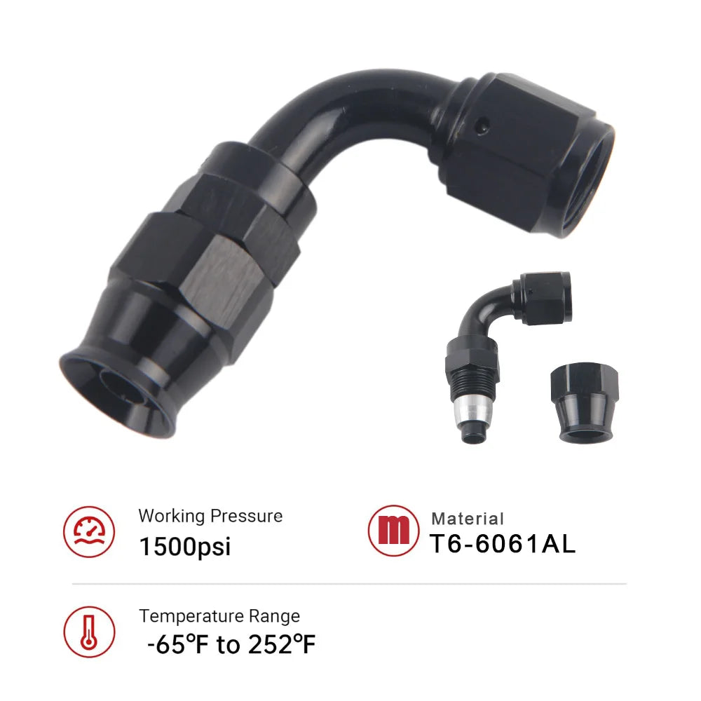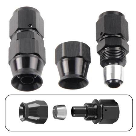 Запознайте се с комплекта адаптери за завъртане на маркучи AN4/6/8/10 PTFE Oil Fuel в черно — здрав, еднокомпонентен край на маркуча от PTFE, който се захваща за ядрото на маркуча за плътно уплътнение и захваща неръждаемата стоманена външна оплетка за отлично задържане. Алуминиевото тяло с издръжливо черно покритие е леко, но здраво, идеално за автомобилни, морски или работилнични горивни линии.