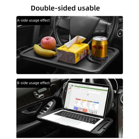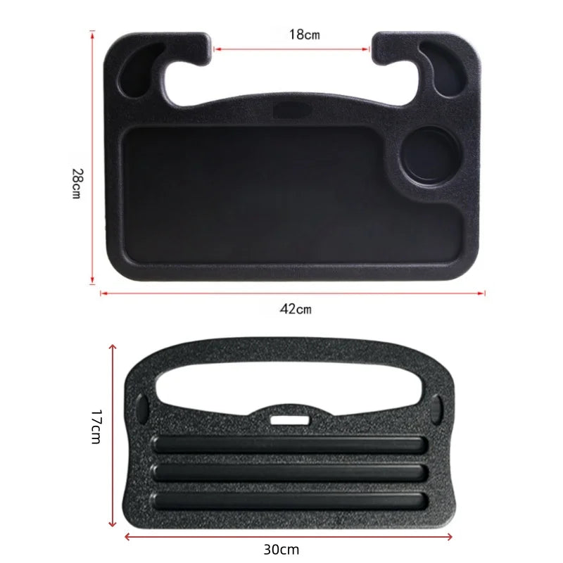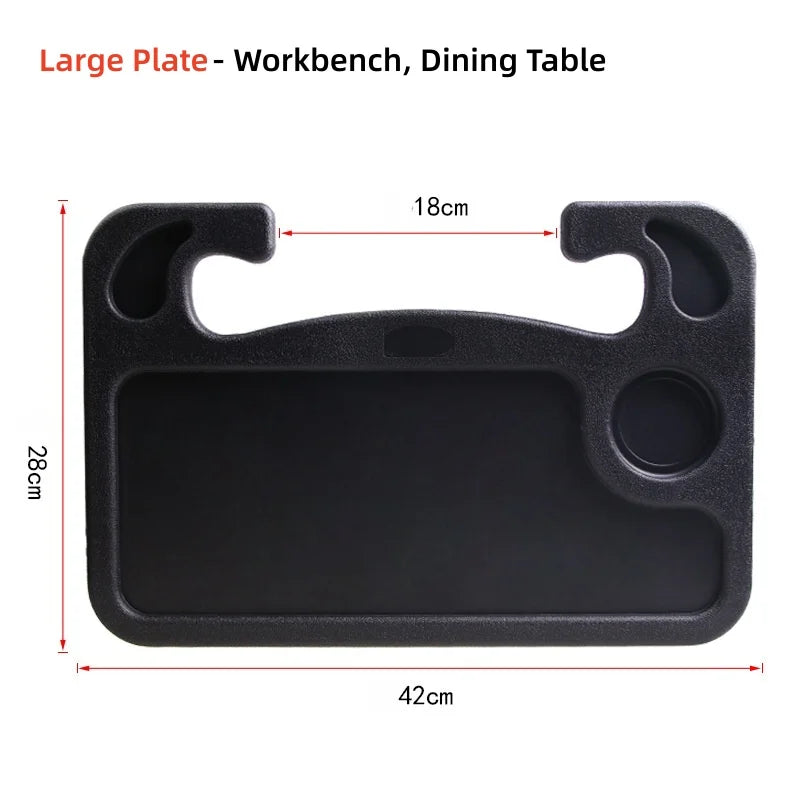 - Настройка в колата: Поставете подноса на волана или на равна повърхност, за да създадете стабилна работна зона за бележки, лаптоп или таблет по време на пътувания или почивки.