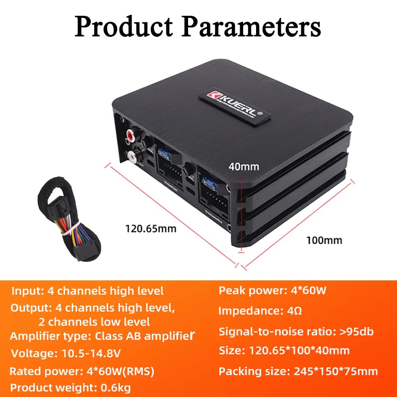 KUERL K-DSP4 работи с мощност на автомобила от 10.5–14.8V и предоставя 4 x 60W RMS при 4 Ω, с максимална мощност от 320W. Той предлага широк честотен обхват (20 Hz–35 kHz) за пълен обхват на звука и верен честотен диапазон (20 Hz–35 Hz) като част от настройките си. Усилвателят предлага ниско ниво на изкривяване (<0.01%) и силно съотношение сигнал-шум (91–100 dB), за да поддържа музиката чиста дори при високи нива на звука. Черното му покритие и здравият алуминиев корпус се съчетават с повечето интериори, осигурявайки надеждно разсейване на топлината и дълготрайна издръжливост. Проектиран за универсални настройки на Android телефони, този модел е готов да се интегрира в различни конфигурации на автомобилното аудио. Забележка: този продукт има два модела, 4x60W и 6x60W.