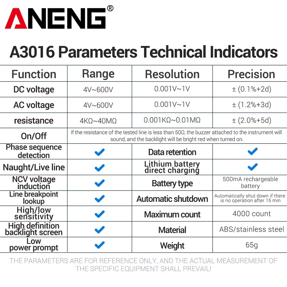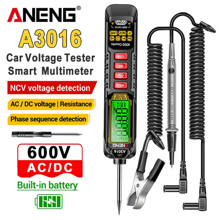 Запознайте се с цифровия мултиметър Aneng A3016 тип химикалка — компактен, безконтактен интелигентен тестер, който се побира в дланта на ръката ви, докато предоставя мощни измервания за променливо и постоянно напрежение, съпротивление и още. Проектиран за бързи проверки на окабеляване, автомобилни системи и проекти "направи си сам", този мултиметър тип химикалка комбинира издръжлива метална сонда с LCD дисплей с висока разделителна способност и подсветка за ясни показания в всяка среда. Леката, преносима форма и автоматичното изключване ви помагат да останете организирани в движение, докато функциите за откриване на фазова последователност и съхранение на данни улесняват диагностицирането на трифазни системи и запазването на запис на вашите измервания. Независимо дали сте професионален електротехник или ентусиаст "направи си сам", A3016 прави електрическите тестове по-безопасни, по-бързи и по-удобни.