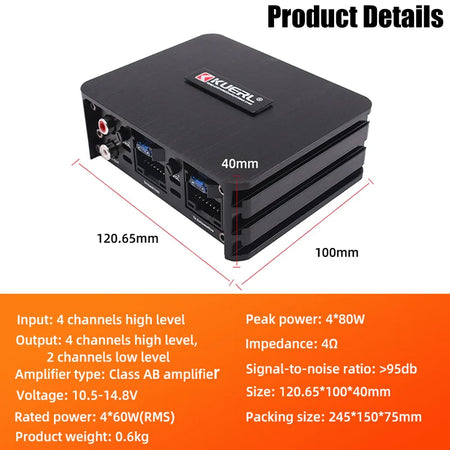 Запознайте се с KUERL K-DSP4 автомобилен усилвател — мощен четириканален усилвател от клас AB с вграден DSP, който ви дава контрол над звуковата сцена. С 4 x 60W RMS при 4 Ω, той осигурява ясна, динамична мощност на всички канали, докато интегрираният DSP ви позволява да настроите EQ, точки на разделяне и времеви настройки за прецизно изображение и балансиран бас. Проектиран за неразрушителен монтаж, този компактен и здрав уред се вписва дискретно в повечето превозни средства, без да променя панели или интериори. Изграден от издръжлив алуминиев сплав и с елегантно черно покритие, K-DSP4 съчетава производителност с чист, модерен вид за всяка автомобилна аудио система.