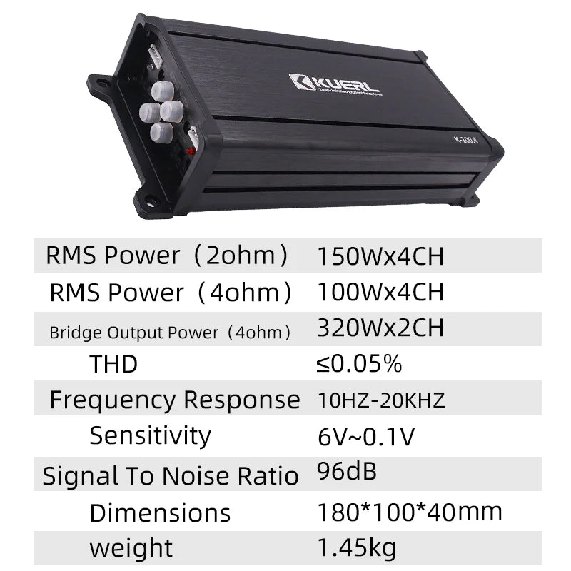 Задвижван от дизайн Class D, K1004 предлага до 1600W обща мощност на четири канала, предоставяйки достатъчно резерв за управление на пълен набор от говорители. Усилвателят поддържа импеданс 2/4 ома, осигурявайки гъвкава съвместимост с широк спектър от говорители. С широк честотен обхват от 10 Hz до 20 kHz, многоканално кодиране и съотношение сигнал/шум от 96 dB, ще се насладите на дълбок бас, ясни средни тонове и кристални високи тонове с минимален шум.