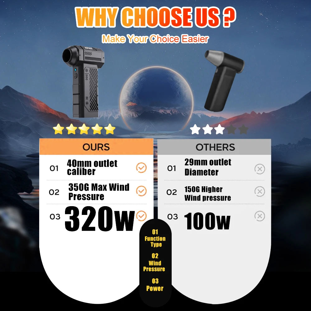 Устройството съчетава издръжливост с преносимост. То разполага с ABS корпус, прецизна CNC метална турбина и безчетков мотор за гладка и надеждна работа. Вградената 18650 Li-батерия захранва безжичната работа, докато Type-C зареждането поддържа 18W бързо зареждане за по-бърза употреба. Четиристепенният контрол ви позволява да настроите вятъра според задачата — деликатна електроника, козина на домашни любимци или бързо сушене — без да натоварвате повърхностите. EU щепселът го прави готов за европейска употреба веднага след разопаковане.