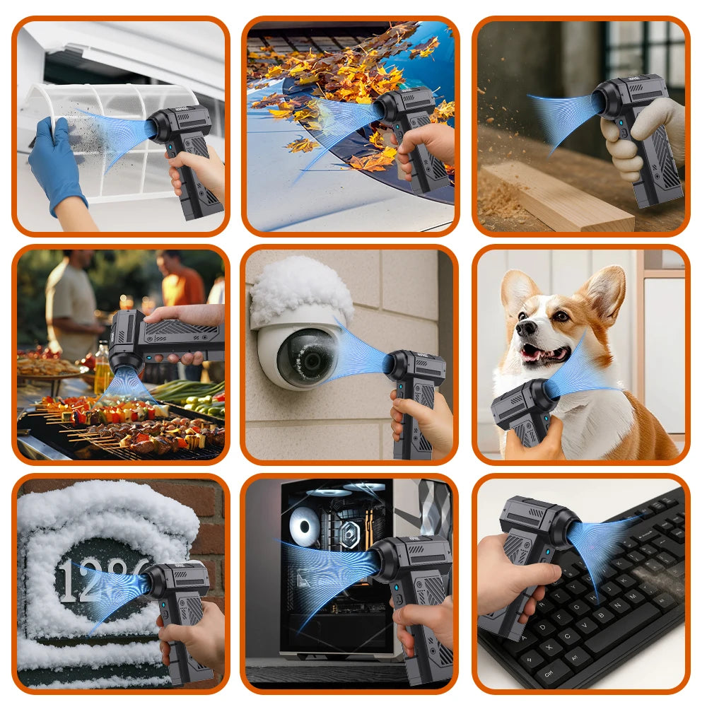 Запознайте се с безжичния сешоар за кучета с 130K RPM турбо вентилатор, преносим въздушен дюкер — компактен, високоскоростен вентилатор, създаден да опрости грижата за домашни любимци, почистването на електроника и бързите задачи в движение. Способен да достигне до 130,000 RPM с максимална скорост на вятъра от 52 м/с, той осигурява мощен въздушен поток в джобен размер. Безжичният му дизайн означава, че можете да почиствате, сушите или дюхате навсякъде, без да сте свързани с електрически контакт.