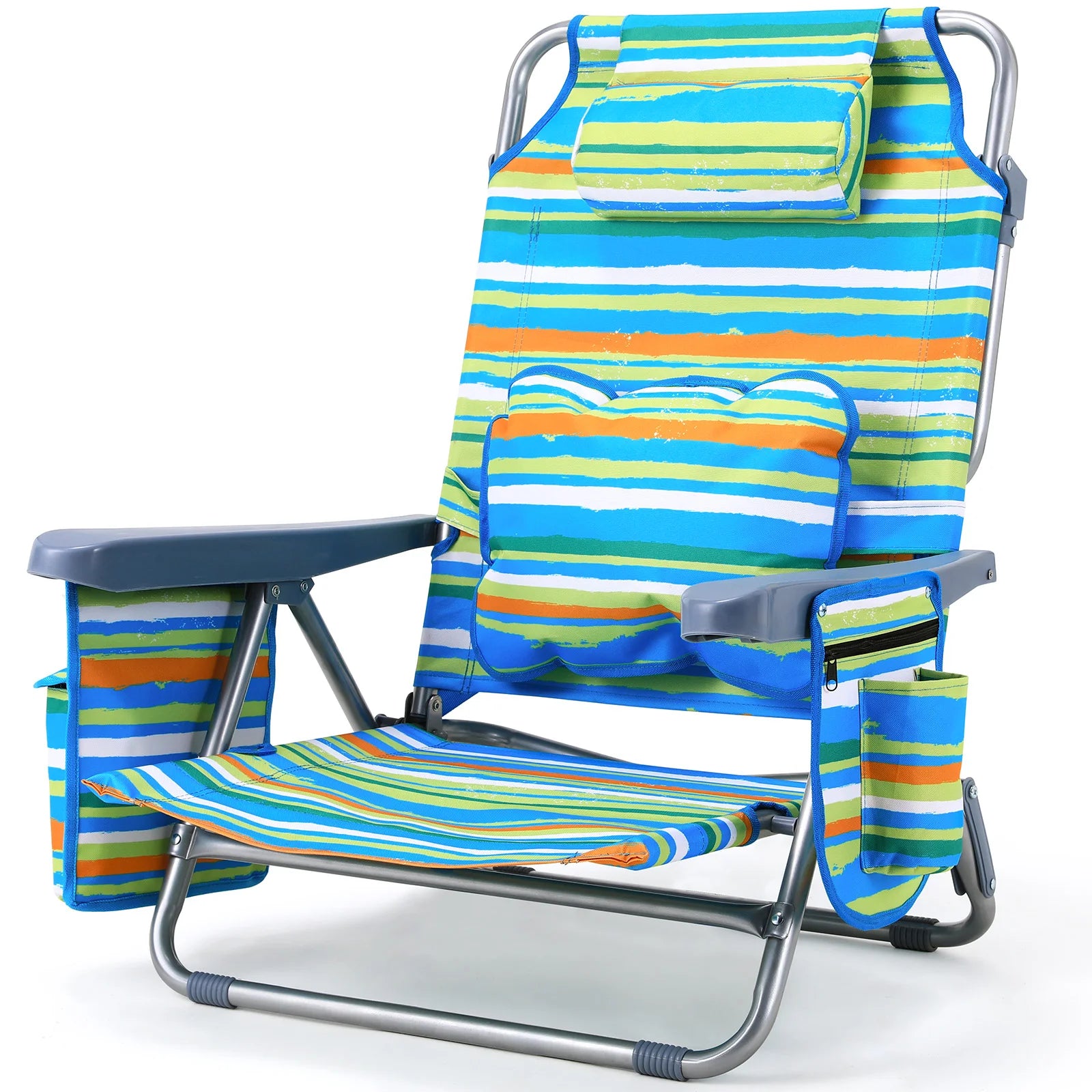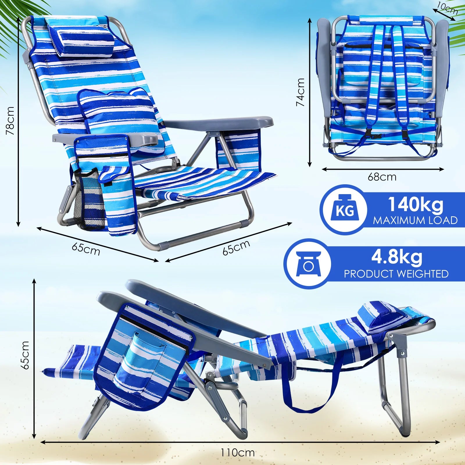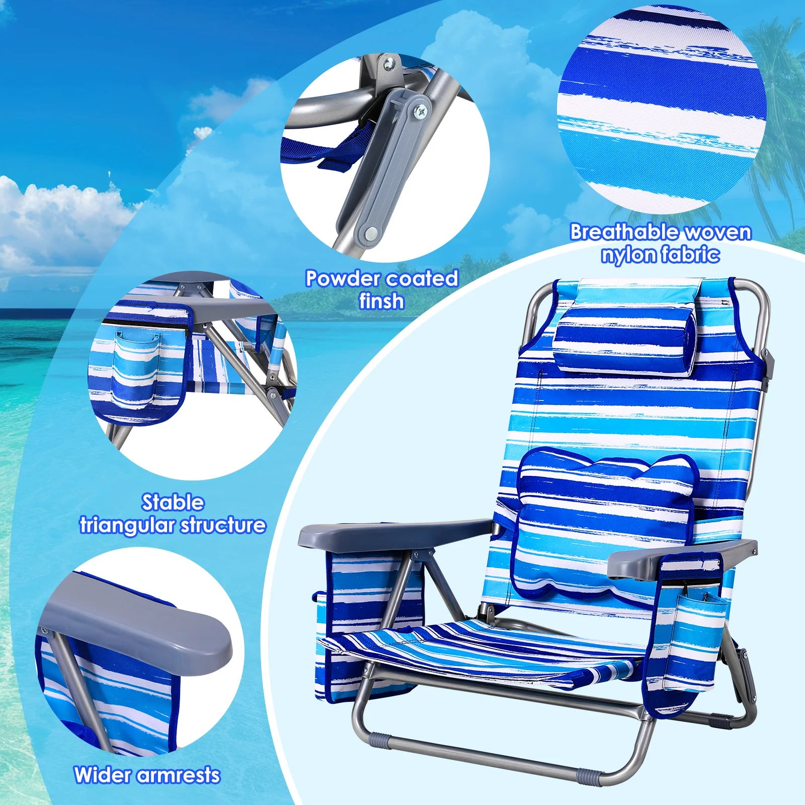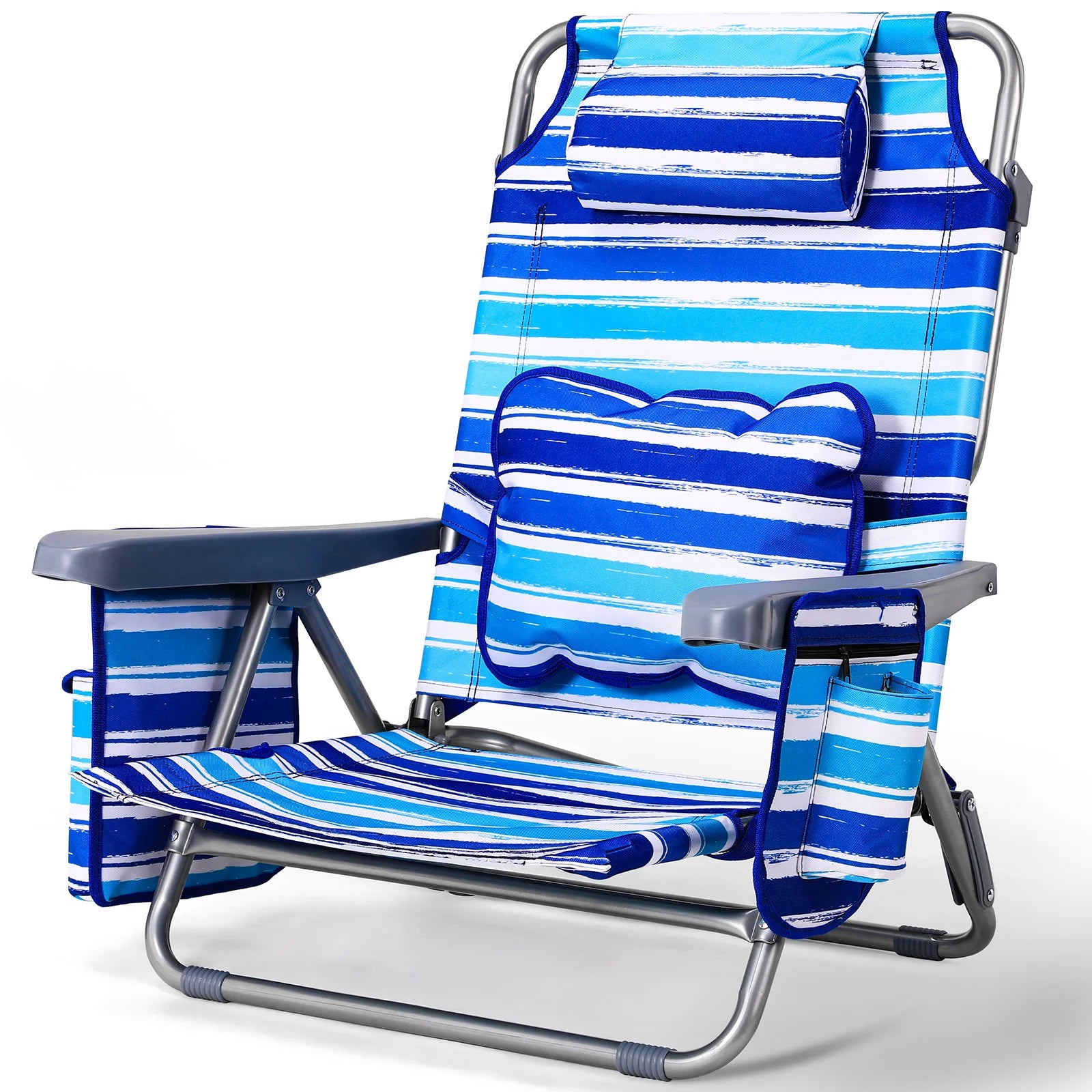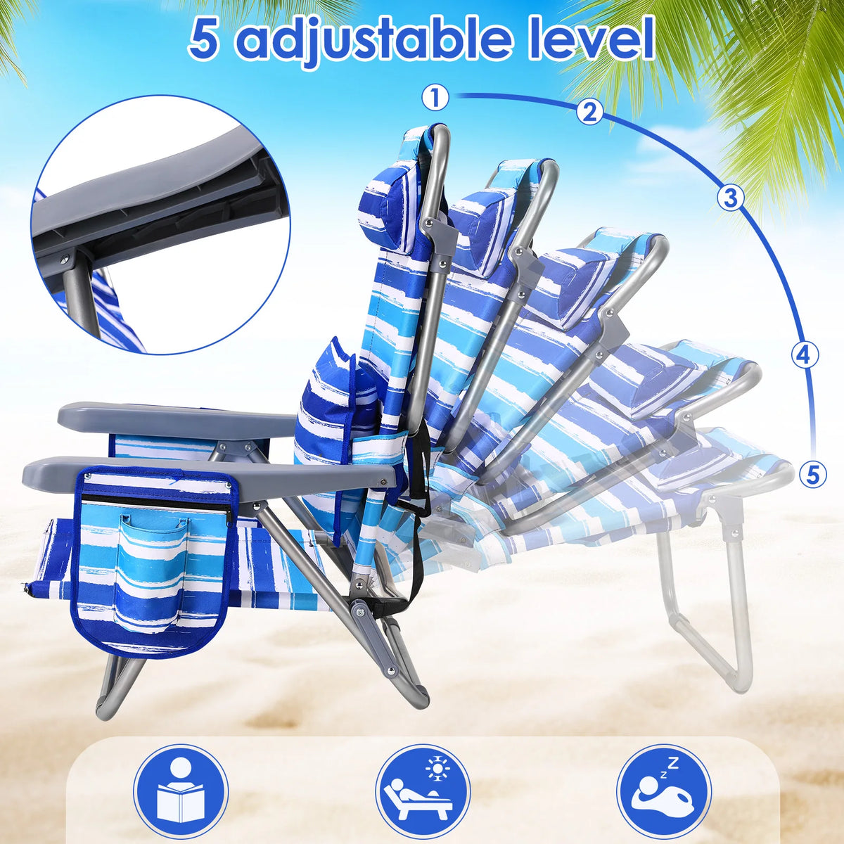 Запознайте се със Сгъваемия алуминиев плажен стол с 5 позиции на наклон и държач за чаша — перфектната комбинация от лекота на пренасяне и комфорт през целия ден за вашите приключения на открито. Изграден с здрава алуминиева рамка, устойчива на ръжда и корозия, този стол е готов за плажа, парка или почивка в двора. Той има модерен стил с висока облегалка, подплатена облегалка за глава и удобна седалка, която се адаптира към вас с 5 позиции на наклон. Височината на седалката от 29.2 см и ширината от 49.5 см осигуряват достатъчна опора, докато облегалката с височина 83.1 см поддържа вашата поза отпусната, независимо дали се наслаждавате на слънцето или търсите сянка.