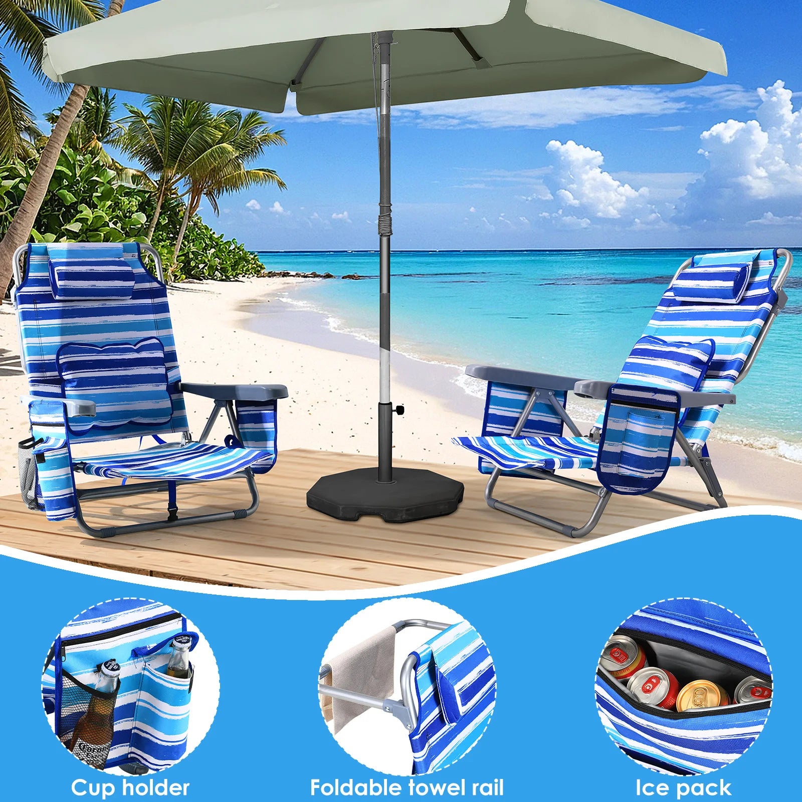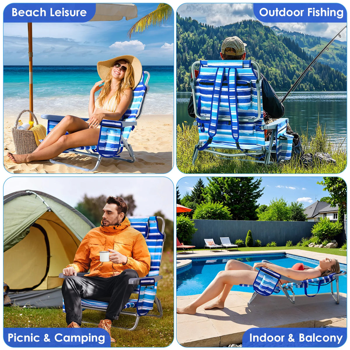 - Характеристики: Държач за чаша, подплатена облегалка за глава, 4-в-1 страничен джоб (държач за телефон, държач за чаша, отварачка за бутилки, джоб за списания), голяма хладилна чанта, заден джоб за съхранение, лост за кърпи, регулируеми презрамки за раница, презрамка за рамо