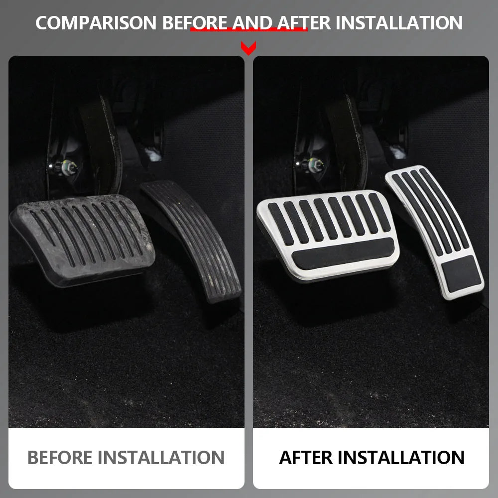 - Лесен монтаж: капакът за педала на газта се плъзга; капакът за педала на спирачката изисква премахване на оригиналната гумена подложка преди поставяне — не са необходими специални инструменти.