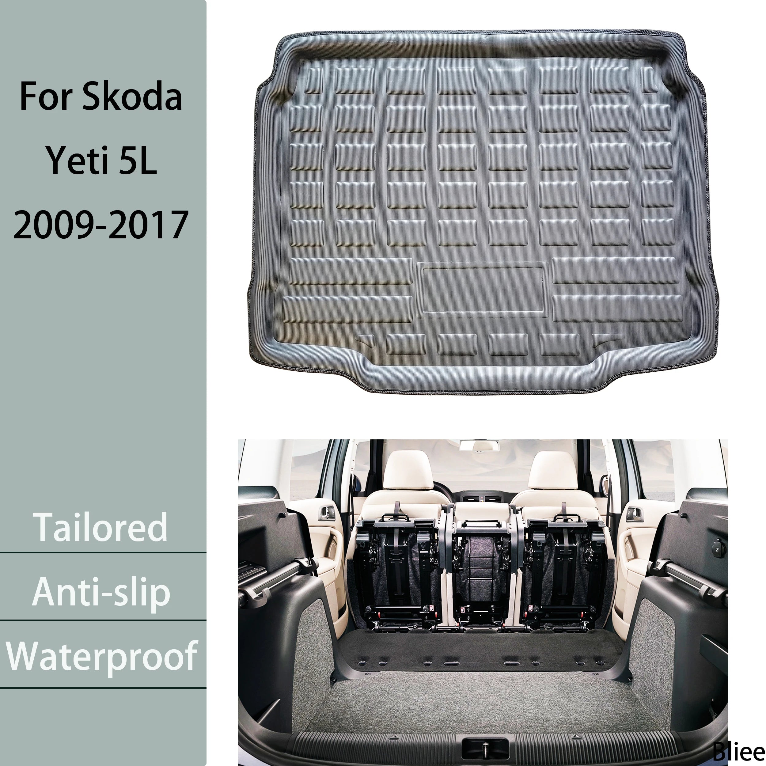 - Персонализирано прилягане за долния под на багажника на Skoda Yeti 5L Sedan (2009–2017), за да се предотврати преместването по време на пътуване.