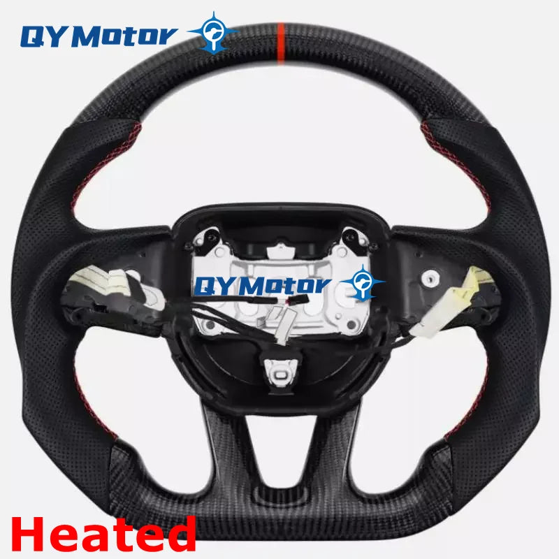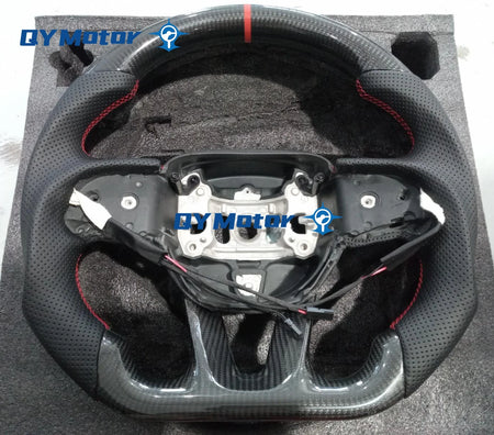 Подобрете вашето изживяване с Dodge с волана от карбонова влакна с отопление Dodge Challenger SRT Hellcat. Изработен от истински карбонови влакна с перфорирана кожа, този волан съчетава естетика с висока производителност и премиум тактилен захват. Плоският D-образен състезателен дизайн подобрява контрола и пространството за краката, докато пръстовите захвати осигуряват уверено управление на завои или по време на динамично шофиране. Червените шевове добавят смел, вдъхновен от състезания детайл, който допълва интериора ви. Воланът е отопляем, което поддържа ръцете ви топли и осигурява стабилно усещане за управление в студено време или при ранни сутрешни пътувания.