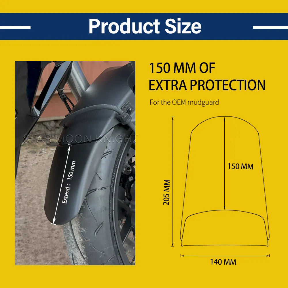 Подобрете своя Honda CB1000 Hornet SP (2025-) с удължителя за преден калник от Star Moon Knight. Този практичен удължител добавя приблизително 150 мм покритие към предния калник, осигурявайки надеждна защита от пръски и допълнително покритие за критичните компоненти на вашия мотор. Той помага да останете по-сухи при влажни условия, като същевременно предпазва зоната на двигателя от пръски и отломки.