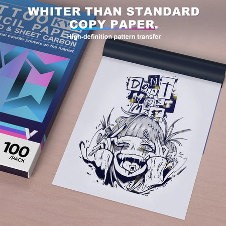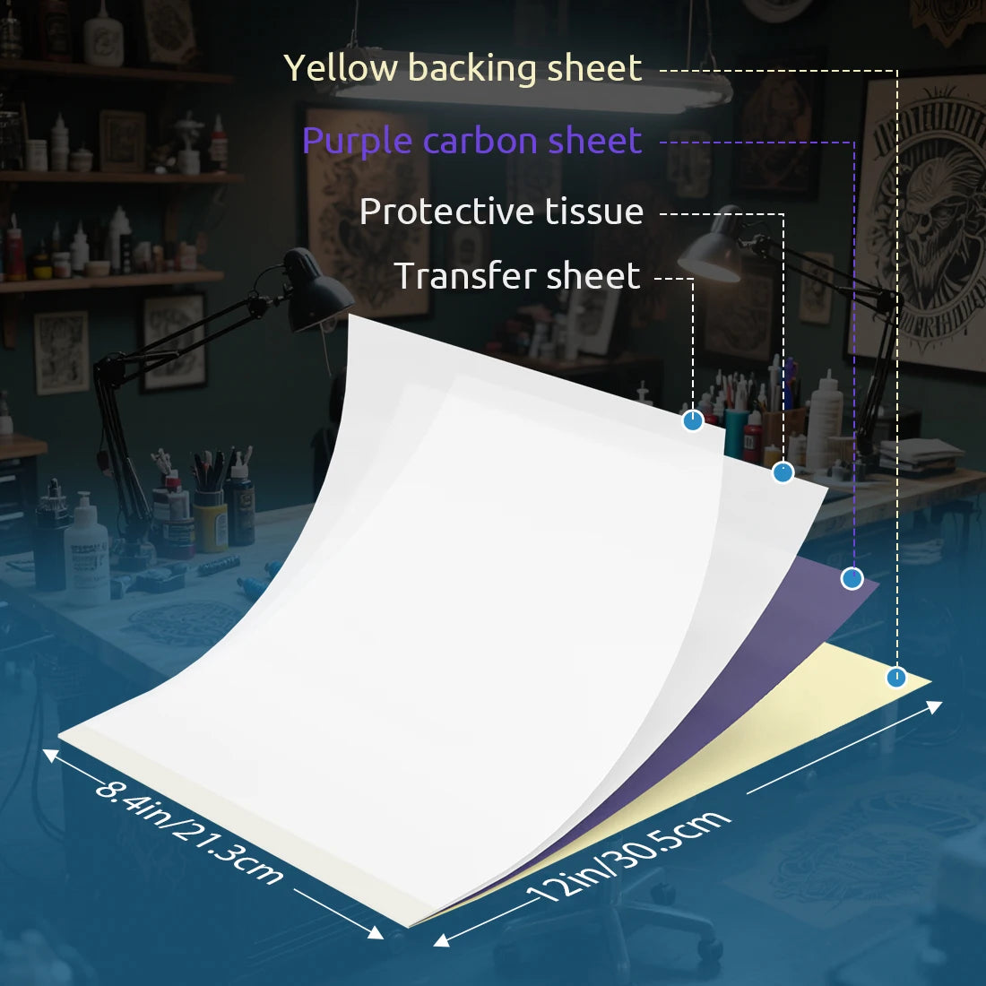 Всяка опаковка включва 100 листа здрава преносна хартия, с размери, подходящи за стандартни A4 шаблони. Идеална за татуировъчни аксесоари и инструменти за перманентен грим, тя осигурява надеждни резултати с минимално размазване и чисти ръбове.