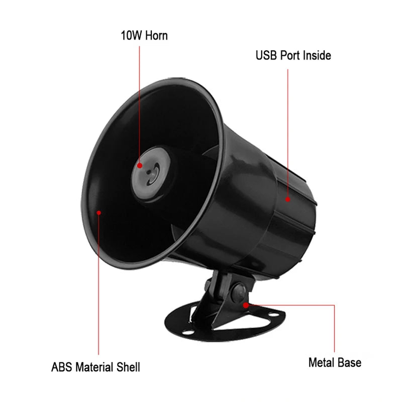Громкият сиренен мегафонен алармен сигнал, модел 601, е мощен многотригърен предупредителен звънец, проектиран да повиши безопасността на обекта. Изработен от здрав ABS пластмасов корпус и завършен в черно, това устройство за предупреждение осигурява ясни, привличащи вниманието сигнали при активиране чрез персонализируемите си опции за задействане. Захранван с DC12V и с мощност до 10W и звуков изход до 120dB, той прорязва околния шум, за да достигне до пешеходци и шофьори там, където безопасността е най-важна. Идеален за опасни работни зони като строителни площадки, операции на голяма височина и разтоварване на товари, той служи като ефективен допълнителен предупредителен метод в съчетание със съществуващите системи за безопасност. Устройството поддържа MP3 аудио (16–320 kbps) и 8Ω/10W изход, което ви позволява да адаптирате съобщенията към конкретната си среда. Компактен по размер (102 × 101 × 128 мм) и предназначен за вътрешна или външна употреба, модел 601 съчетава надеждност с лесна интеграция. Предоставя се лесен процес за смяна на аудиото, за да персонализирате предупредителните съобщения: конвертирайте необходимото аудио в MP3, поставете го на USB устройство в папка с име “00” и свържете отново устройството, за да възпроизведе актуализираното съобщение.