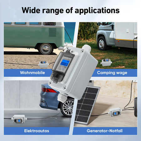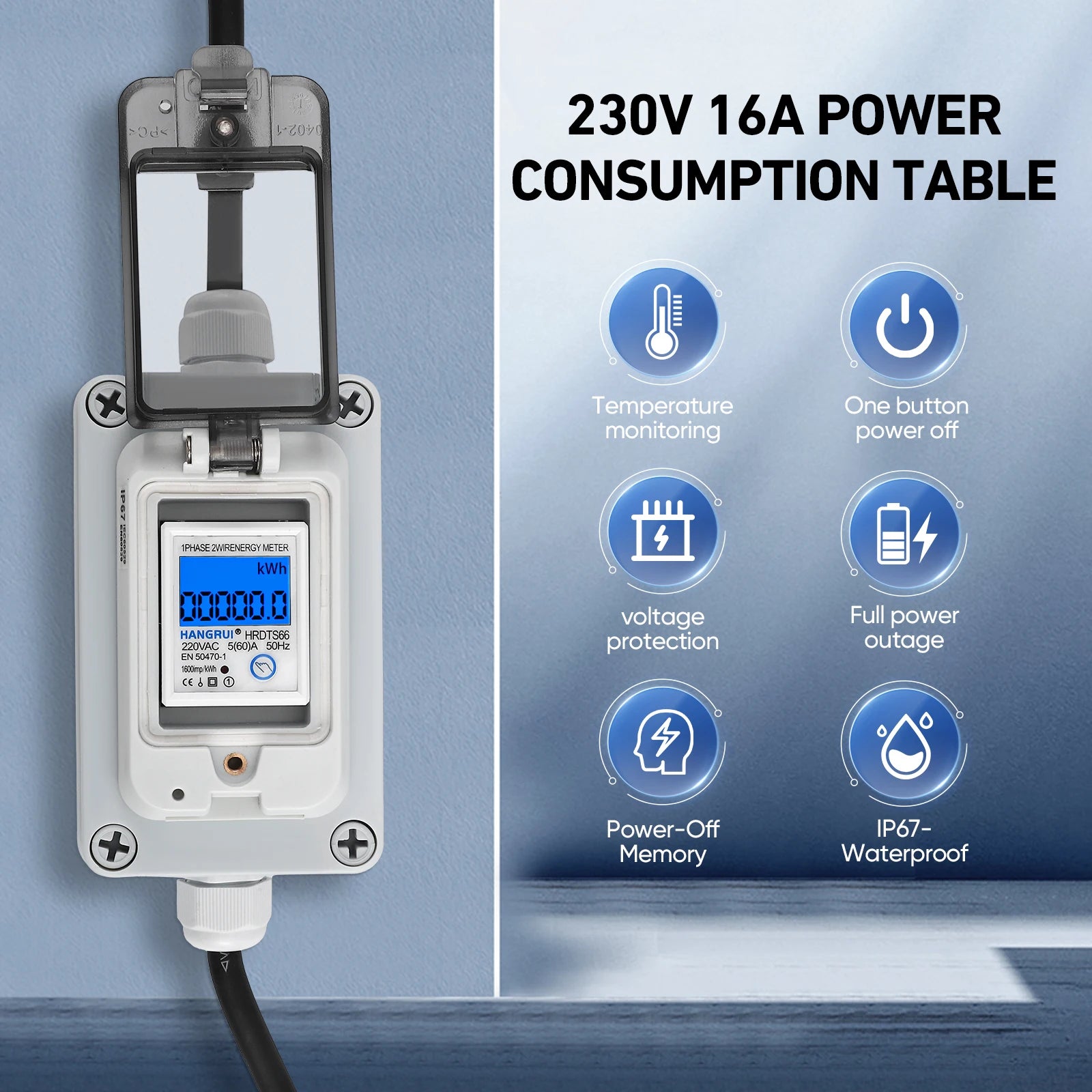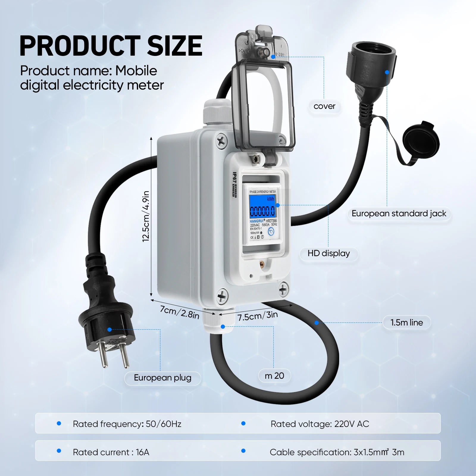 Поемете контрол върху енергийната си консумация с мобилния цифров електромер Jugacool. Този преносим KWh метър 230 V, 60 A е проектиран за външна и влажна среда, с водоустойчив рейтинг IP67. Мониторингът на енергията в реално време ви помага да идентифицирате устройства с висока консумация, да оптимизирате използването и да намалите разходите за електричество. Яркият LED дисплей ви дава ясни и моментални показания, а функцията за запаметяване съхранява данните ви след прекъсване на захранването, за да не губите следа от потреблението си. Лесната инсталация тип plug-and-play идва с издръжлив гумен кабел, защитен щепсел и защитен конектор за безопасна употреба на открито. Компактният и лек дизайн е идеален за каравани, кемпери, електрически превозни средства и ежедневна семейна употреба, превръщайки всеки външен контакт в надежден енергиен монитор.