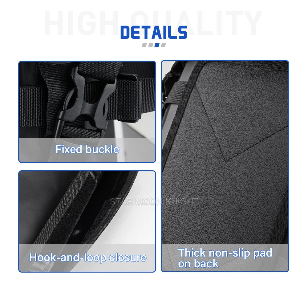 Дръжте инструментите си организирани и защитени в движение с водоустойчивата чанта за странична рамка на Suzuki V-Strom. Изработена от здрав TPU, тази универсална чанта за инструменти се закрепва сигурно към страничните рамки за защита, осигурявайки бърз достъп до основното оборудване без да заема ценно място в страничните чанти. Нейната напълно водоустойчива конструкция предпазва инструментите от дъжд, кал и пресичане на реки, така че можете да карате с увереност при всякакво време. С практичен капацитет от 6–8L, който се разширява при нужда, можете да адаптирате съхранението за всяко пътуване — от ежедневни пътувания до уикенд приключения — докато смелият черен и жълт цвят добавя видимост на пътя и пътеката. Чантата се доставя с удобна презрамка за рамо за лесно носене, когато спрете, зареждате гориво или трябва да преместите оборудването от мотора.