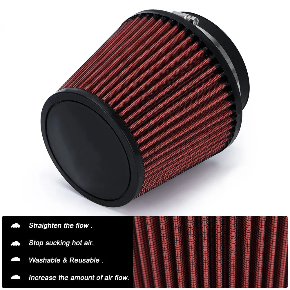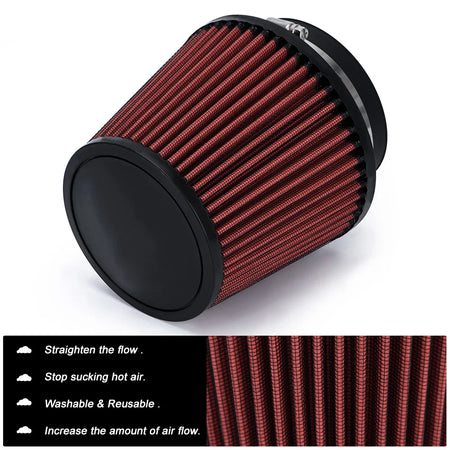 Подобрете дишането на двигателя си с универсалния автомобилен филтър за студен въздух с висока пропускливост, гъбовидна глава в червено. Проектиран за универсално прилягане на 100 мм (4”) входни системи, този филтър с висока пропускливост се монтира лесно, за да осигури по-хладен и по-гъст въздух за двигателя, което води до по-бърза реакция на газта и подобрена мощност.