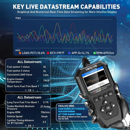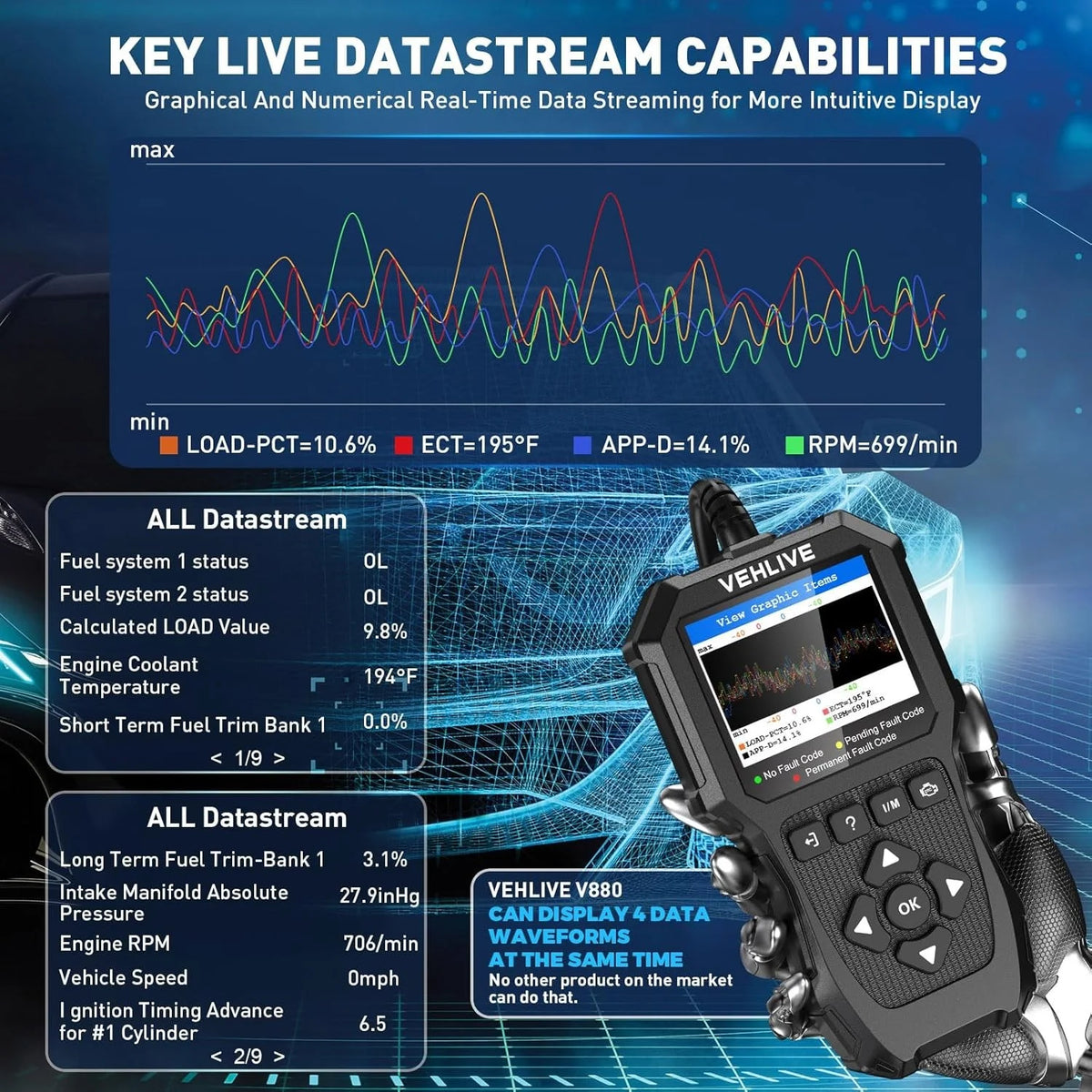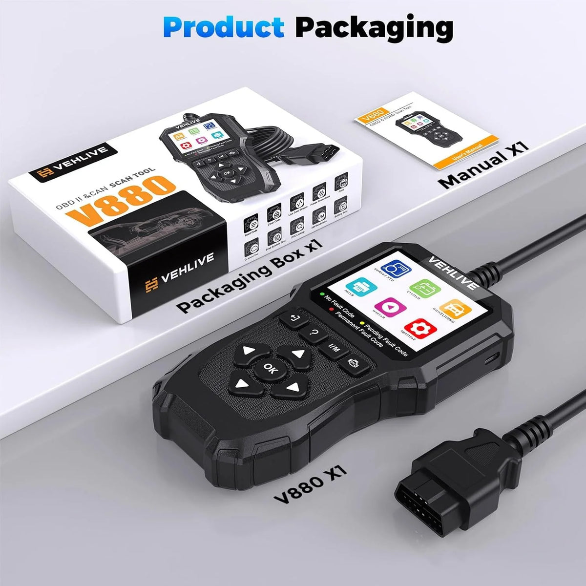 Диагностичният инструмент VEHLIVE V880 OBD2 скенер е универсално решение "всичко в едно" за автомобили Ford, Lincoln, GM, Buick и Volkswagen. Той комбинира пълна OBDII/EOBD диагностика с интегриран тестер за 12V акумулатори, помагайки ви да откриете проблеми с двигателя, да наблюдавате данни в реално време и да проверите здравето на акумулатора - всичко това от едно ръчно устройство. С ярък 2.8-инчов дисплей и актуализации на софтуера за цял живот, ще диагностицирате по-умно и по-бързо, намалявайки времето на престой и догадките.