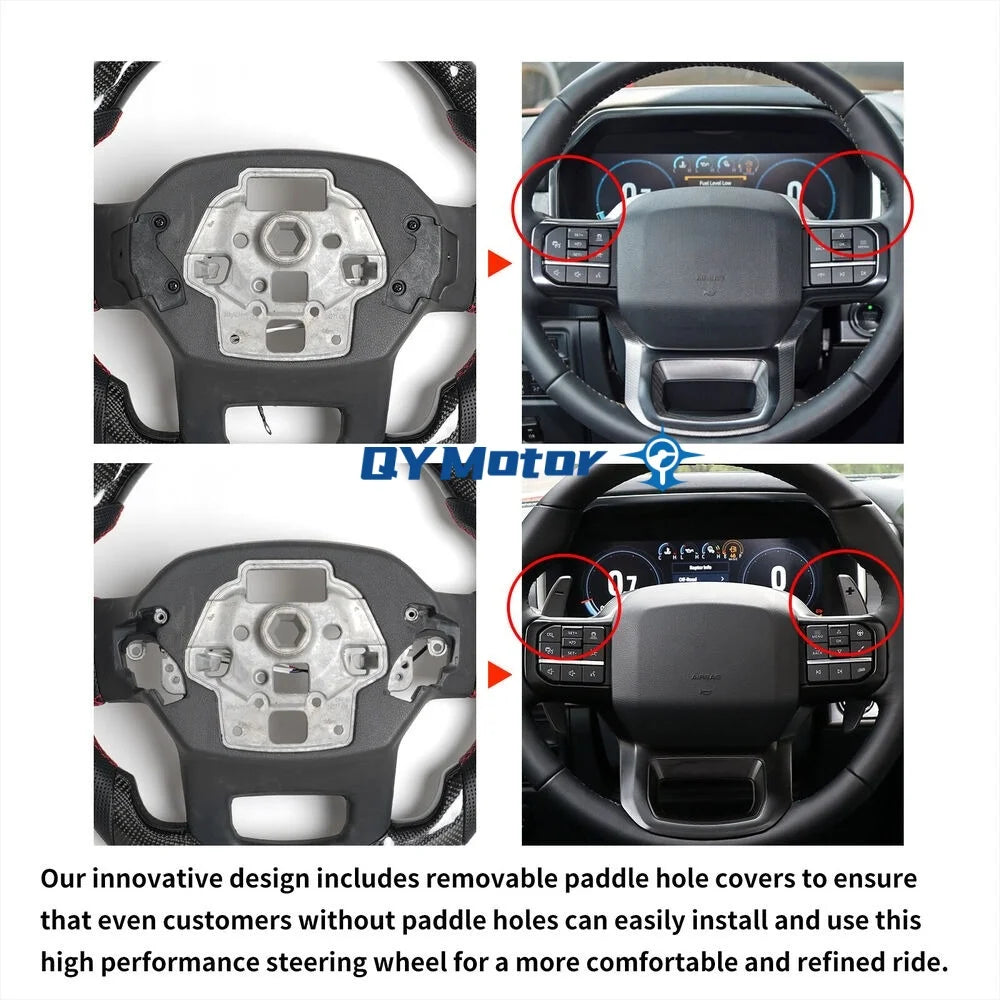 Проектиран за модели Ford F-150 от 2021 до 2025 година, този волан е изработен, за да повиши както усещането, така и стила. Той предлага отоплителна опция за студени сутрини, докато изрезите за лопатки позволяват използването на следпродажбени лопатки (лопатките не са включени). Обърнете внимание, че облицовките, бутоните, лопатките и електрическата инсталация не са включени с този волан.