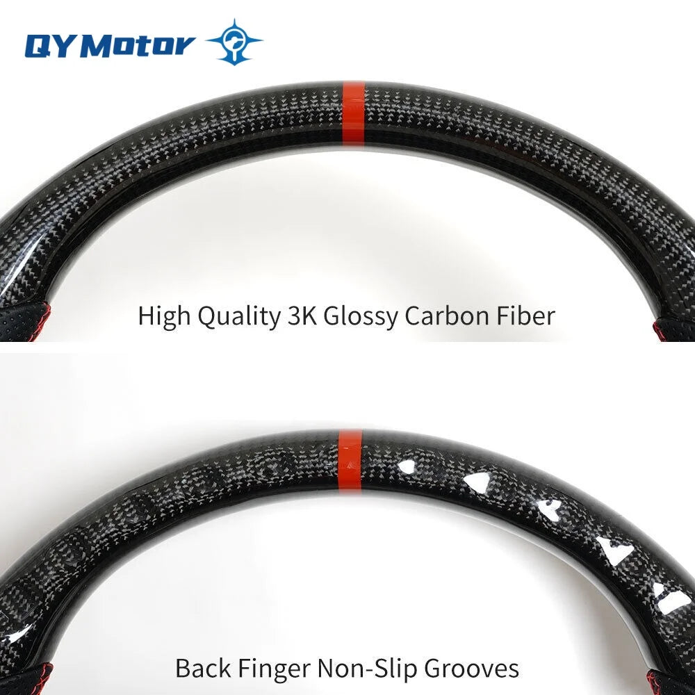 Актуализирайте вашия Ford F-150 Raptor с премиум волан от истински въглеродни влакна, който разполага с перфорирана кожа. Този волан съчетава автентични въглеродни влакна с издръжлива перфорирана кожа, за да осигури леко и отзивчиво захващане, което подобрява както контрола, така и комфорта. Плоският D-тип състезателен дизайн подобрява ергономията в кабината, улеснявайки влизането и бързите маневри, докато усилва спортния естетически вид на вашия камион. Смелото червено шиене и червената лента на 12 часа добавят впечатляващ, високо видим акцент в интериора ви.