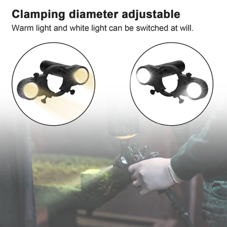 Две вградени лампи (основна светлина и регулируема помощна светлина) предлагат гъвкаво покритие. Има три нива на яркост с функция за запаметяване, която запомня последната ви настройка, когато е включена след повече от 3 секунди. Превключвайте между топла светлина и бяла светлина, за да отговаряте на типа боя и завършек, намалявайки сенките и подобрявайки видимостта на фините детайли при пръскане.