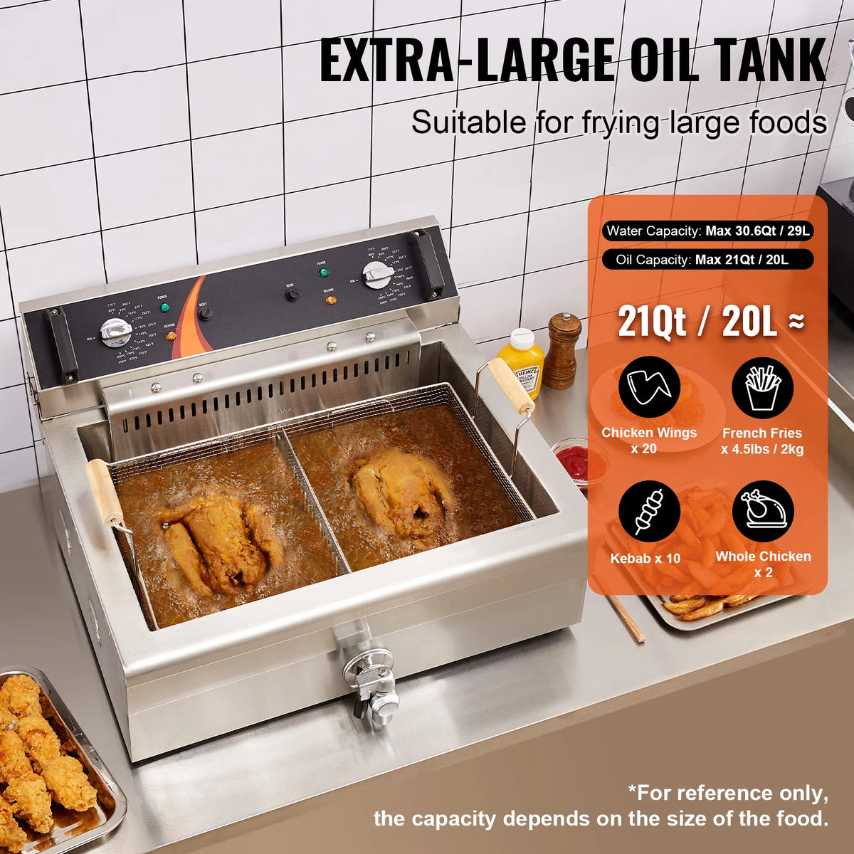 Запознайте се с 3000W Комерсиална Фритюрник 30.6 Qt Неръждаема стомана — мощна, висококапацитетна фритюрна станция, изградена за натоварени кухни. Нейният щедър 21 Qt / 20 L резервоар за масло (максимален капацитет на водата 30.6 Qt / 29 L) и междинен слой ви позволяват да пържите големи предмети, като две цели пилета, докато различните храни остават отделени, за да се предотврати кръстосано замърсяване. Двойните нагревателни елементи осигуряват бързо загряване, така че обслужването да остава бързо и последователно.