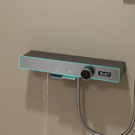 Този душ комплект с дисплей за температура подобрява безопасността, като показва точната температура на водата, предотвратявайки изгаряния и осигурявайки постоянен комфорт. Регулируемата по височина релса и квадратният хромиран дизайн правят инсталацията лесна и подобряват естетиката на вашата баня, като същевременно осигуряват издръжлива производителност от неръждаема стомана.
