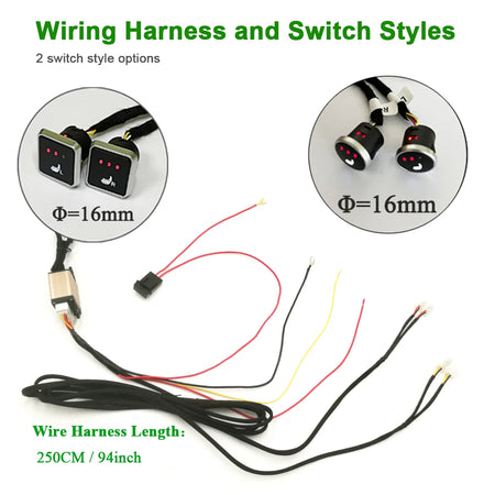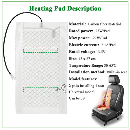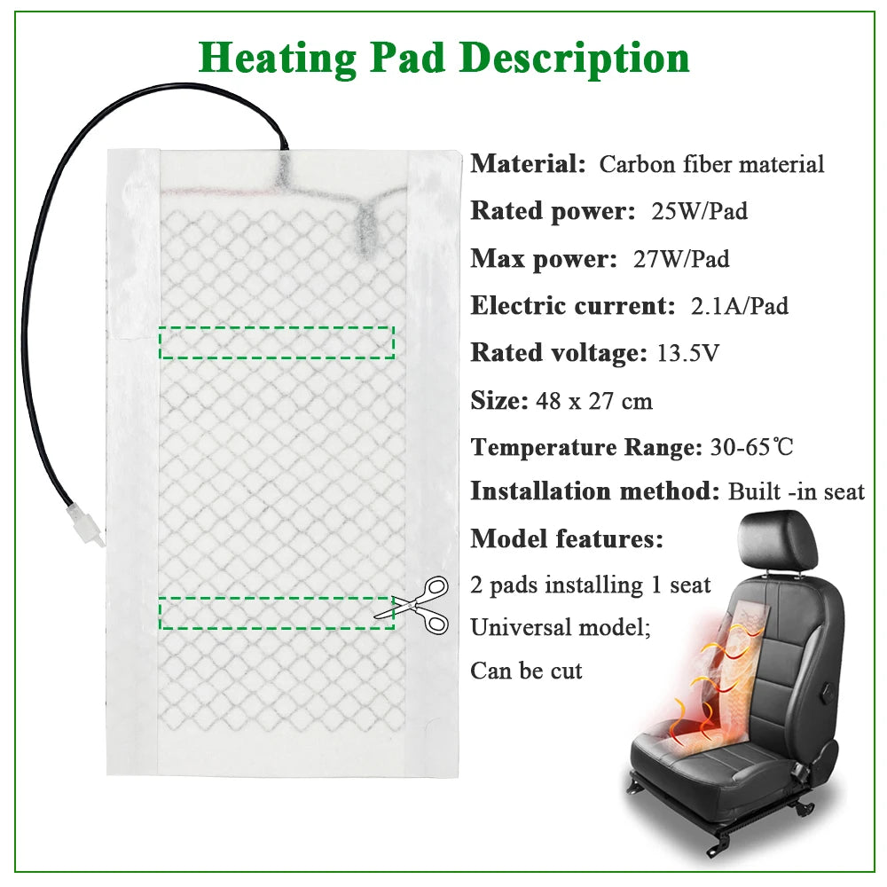 С вградени отоплителни подложки за седалки и двойно контролно превключвател, комплектът осигурява регулируема топлина за две седалки с лесни, контролируеми настройки. Всяка подложка е удобна за рязане, така че можете да оформите отоплителните елементи, за да паснат на извити или неправилни профили на седалките, включително кожени седалки. Системата е проектирана за лесен монтаж и надеждно представяне, осигурявайки ви отоплен комфорт без сложна електрическа инсталация.