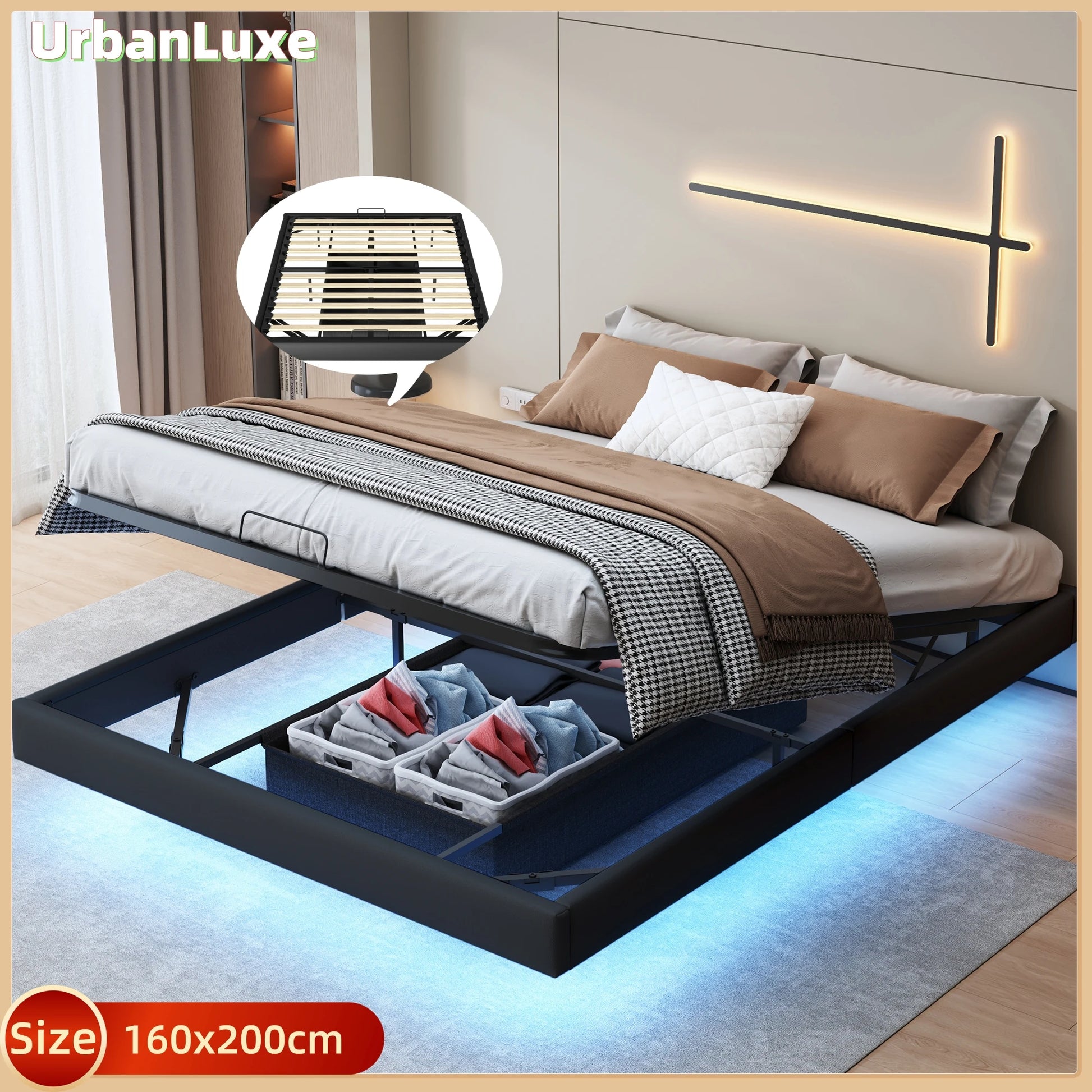 Урбан Лукс 160x200 Легло Със Съхранение И LED Светлинна Лента Черно