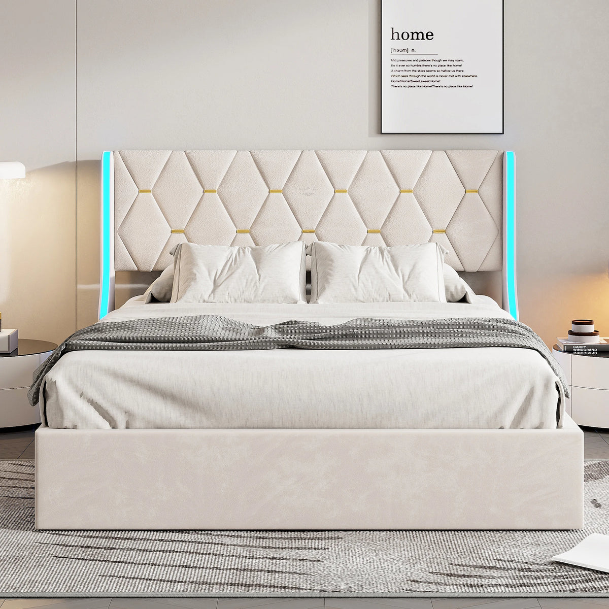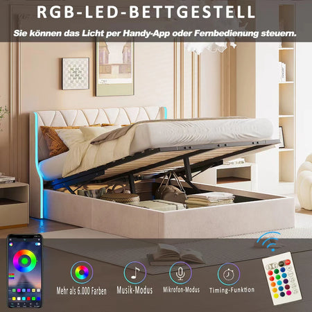 Урбан Лукс 160x200 см леглово рамо с LED лента бежово съхранение