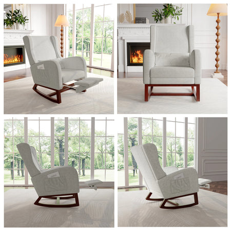 Проектиран за ежедневен комфорт, люлеещият се стол разполага с двустранни джобове от всяка страна, за да държите дистанционните, телефоните и книгите лесно достъпни — така вашите моменти на отдих остават подредени и релаксиращи.