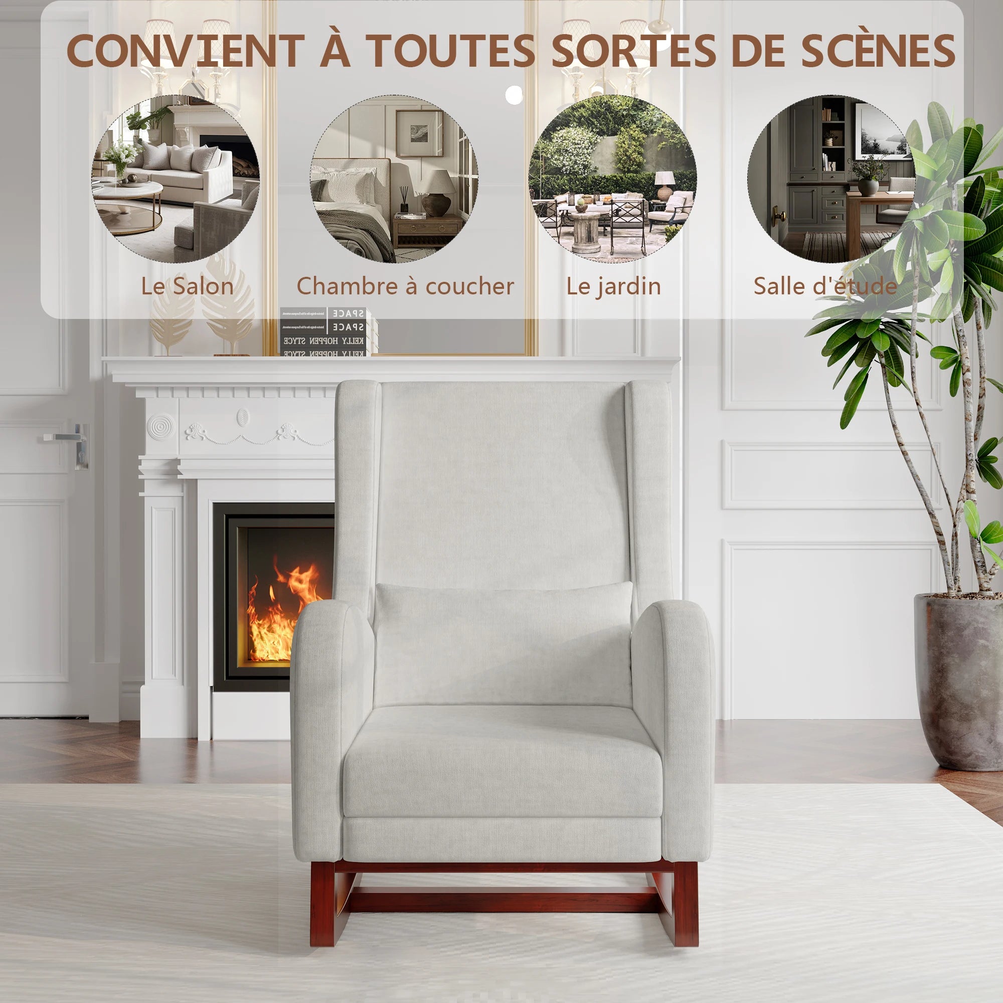 Включените меки възглавници осигуряват опора за врата и глава, гарантирайки безуморна седалка, независимо дали четете, гледате предаване или просто мечтаете на люлка. Памучният калъф на стола се слива със сивите тонове за спокоен, уютен вид, който пасва на дневни, спални или кътчета за четене.