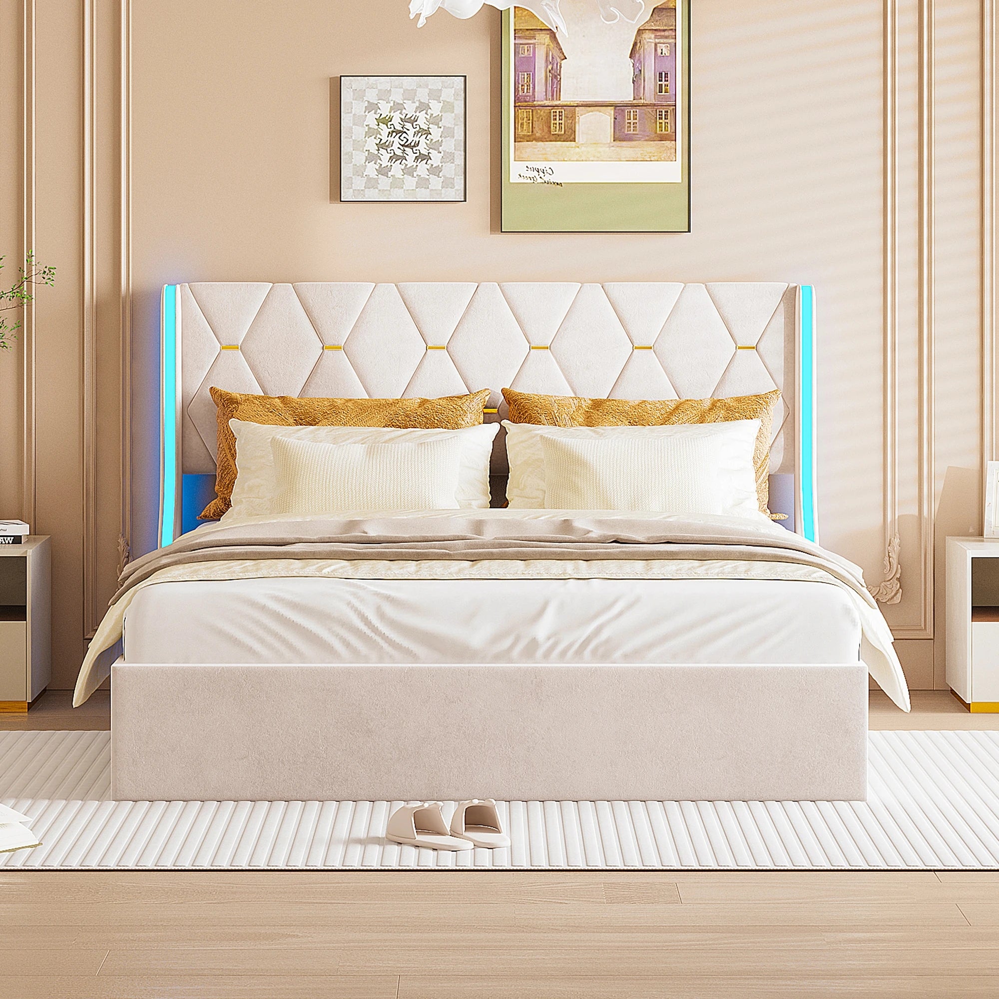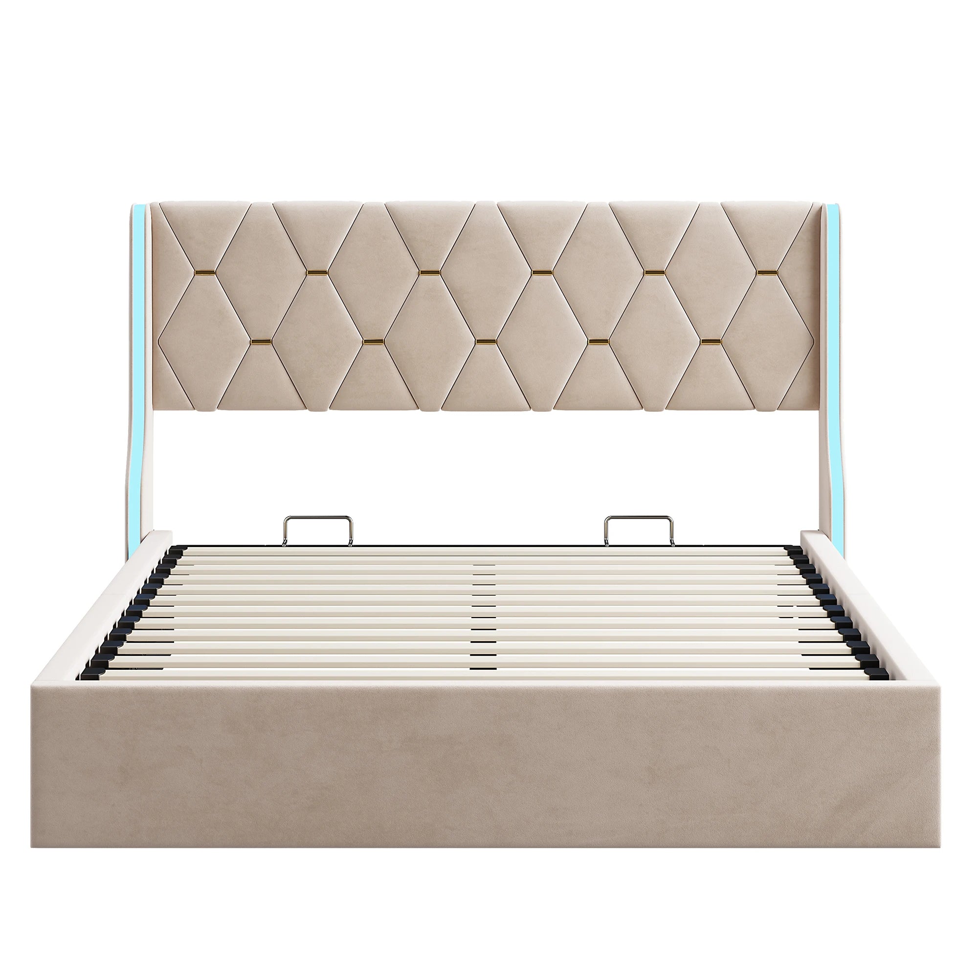 Урбан Лукс Легло 140x200 Велюр Бежово Със Съхранение LED