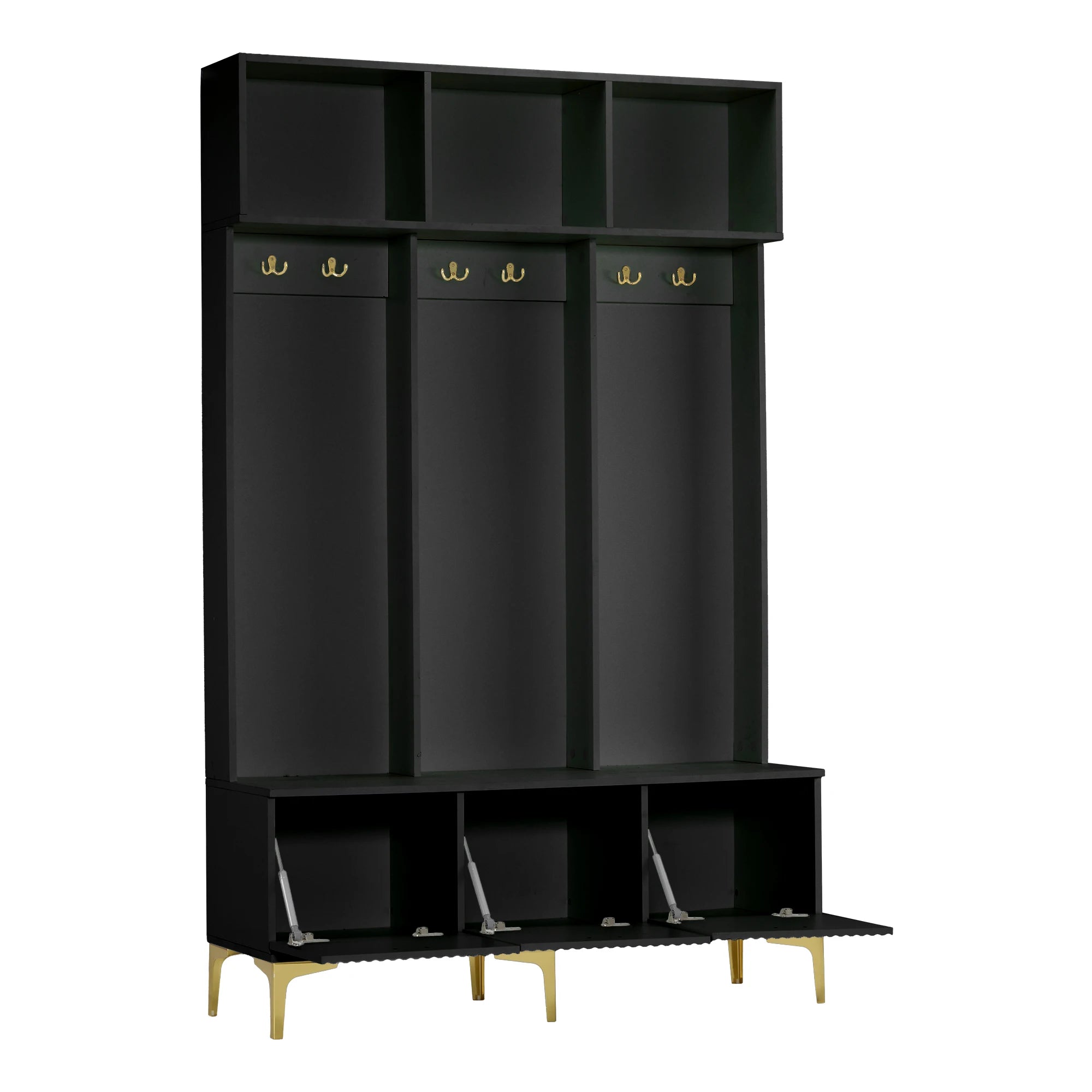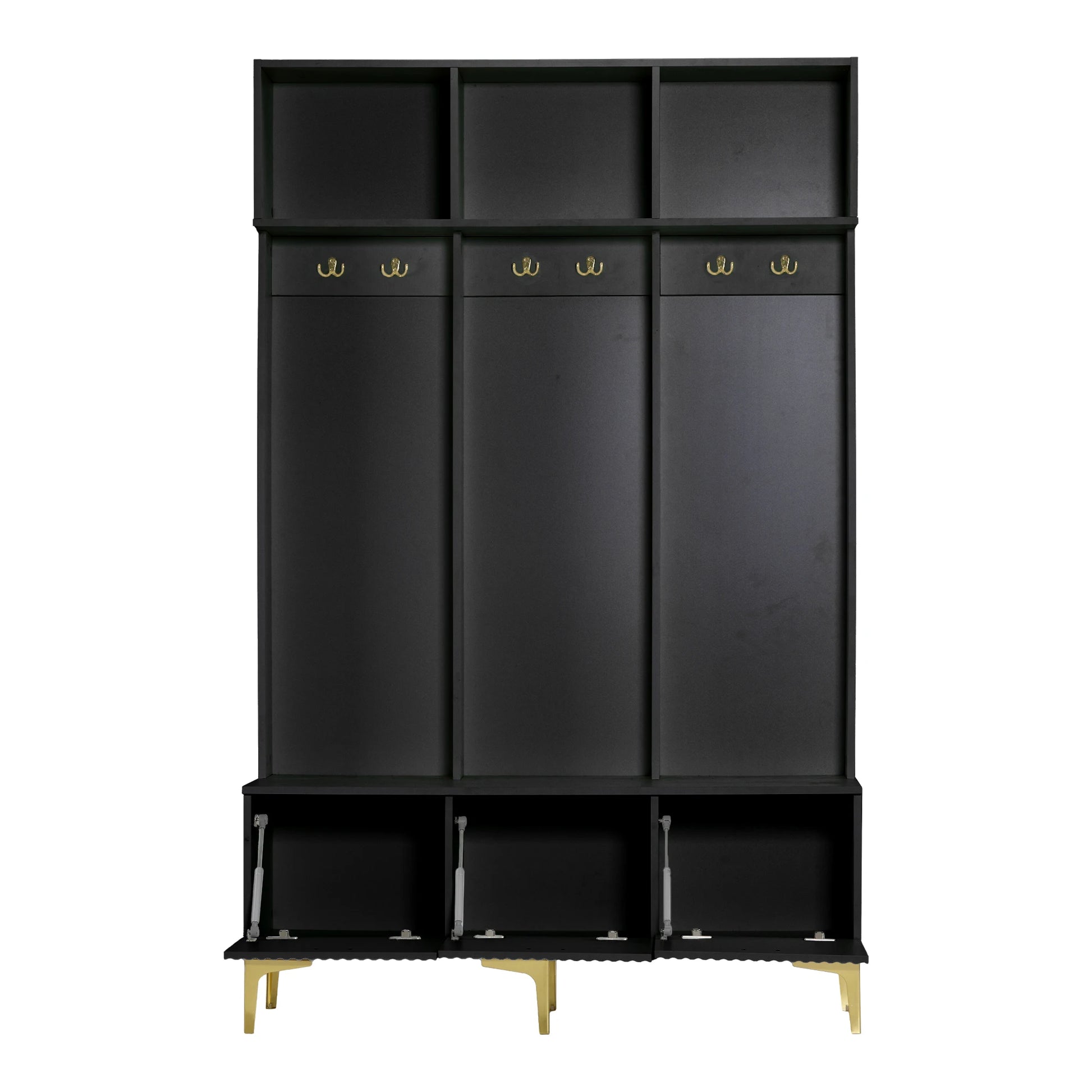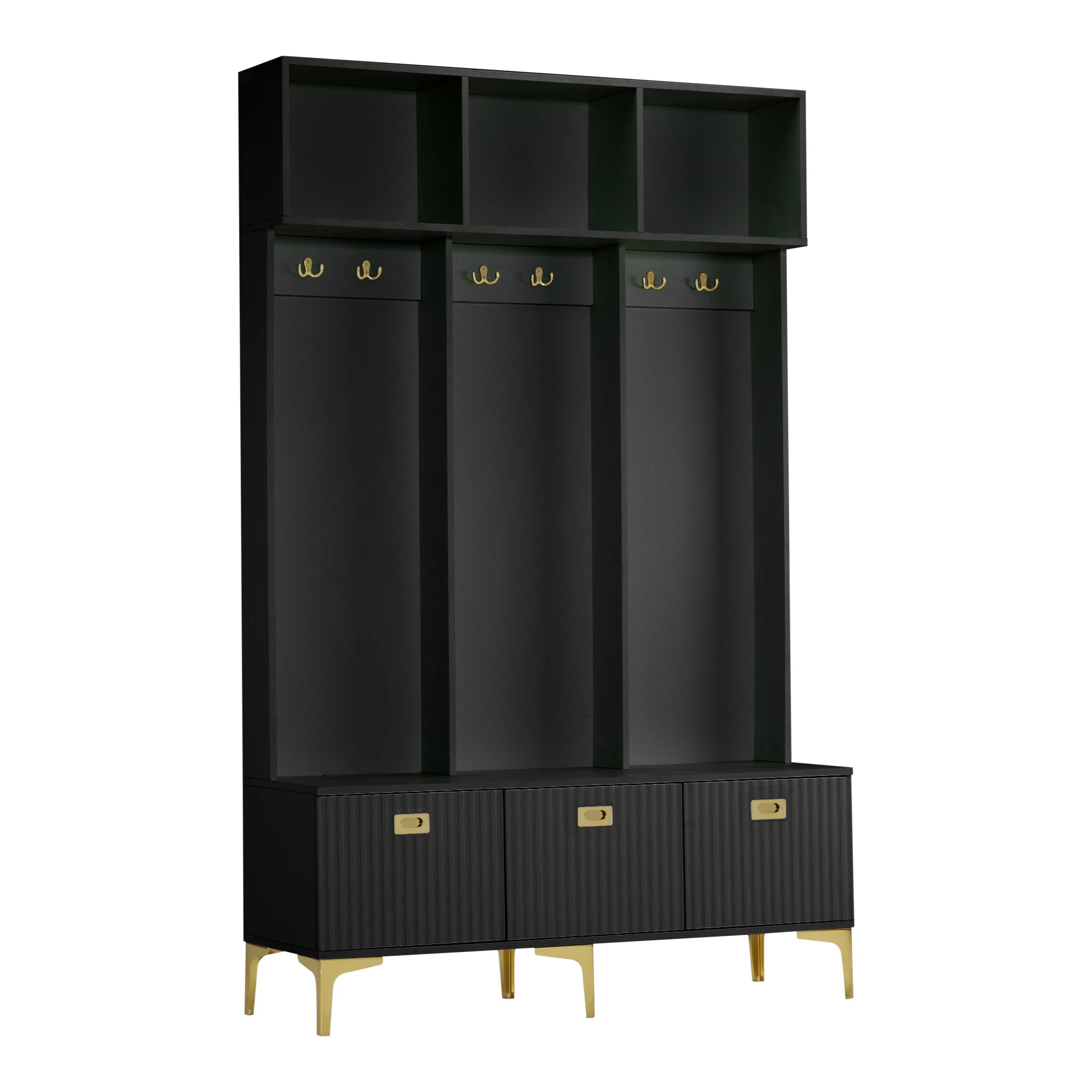Запознайте се с Черния гардеробен комплект с пейка за съхранение за коридор и дневна — стилен, високогланцов коридорен шкаф, проектиран да намали безпорядъка и да подобри входното ви пространство. Този многофункционален модел комбинира закачалка за палта, място за обувки и множество отделения в един стилен елемент, с релефни панели на вратите и лъскави златни куки, дръжки и крака, които добавят нотка лукс към всеки коридор или дневна. Вградената пейка предлага удобно място за сядане при обуване и събуване, като същевременно държи чанти, шалове и ежедневни принадлежности подредени в отделенията си.