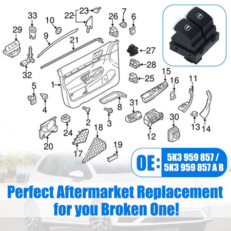 Бутон за управление на прозорците за Volkswagen Golf MK5 от страната на шофьора, ABS пластмасова конструкция