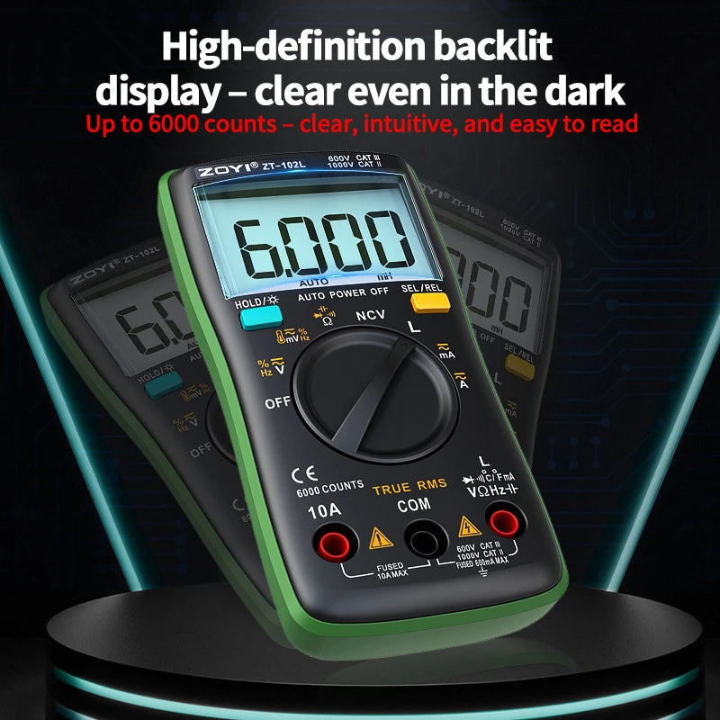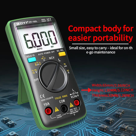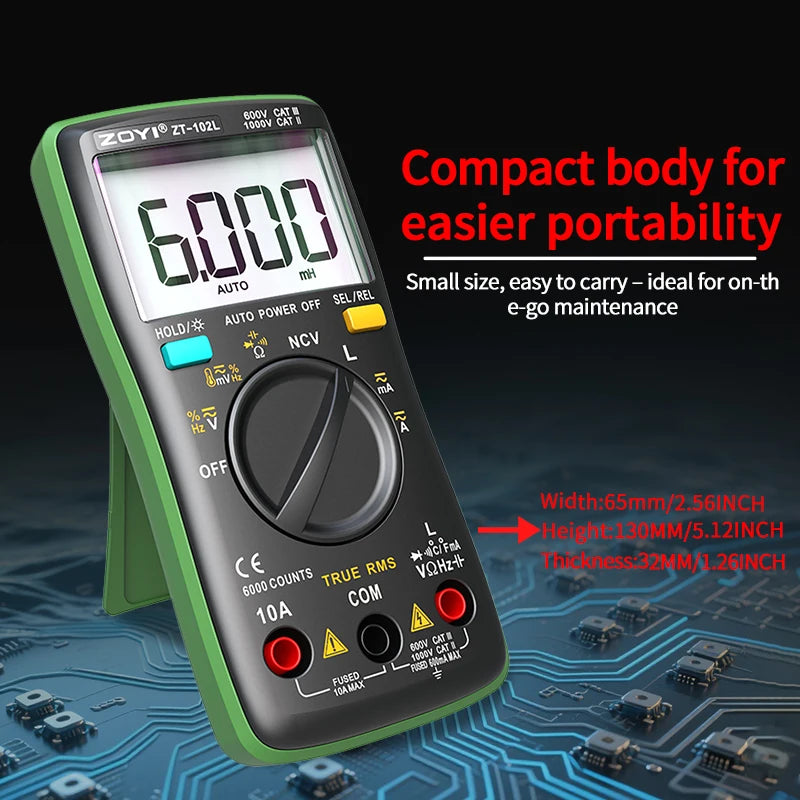 Автоматичният мултиметър за индуктивност ZT-102L е проектиран да опрости сложните електрически измервания. Неговата функция за автоматичен обхват се адаптира към различни тестови среди, осигурявайки ви точни показания без ръчни корекции на обхвата. Защитата против прегряване добавя основен слой безопасност, предпазвайки устройството и вас от електрически претоварвания. С високо прецизно измерване на индуктивността, можете да се доверите на резултатите за проверка на намотки, настройка на филтри и проектиране на вериги. Компактната, преносима форма означава, че можете да я носите между работни маси, превозни средства или обекти на работа, което прави тестовете в движение лесни. Истински универсален тестер, той е подходящ за широк спектър от електрически принадлежности и проекти "направи си сам".