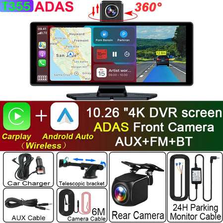 4K Dash Cam s ADAS Dvojitým objektivem, Android Auto a CarPlay, 10,26 palcový displej, noční vidění a parkovací režim