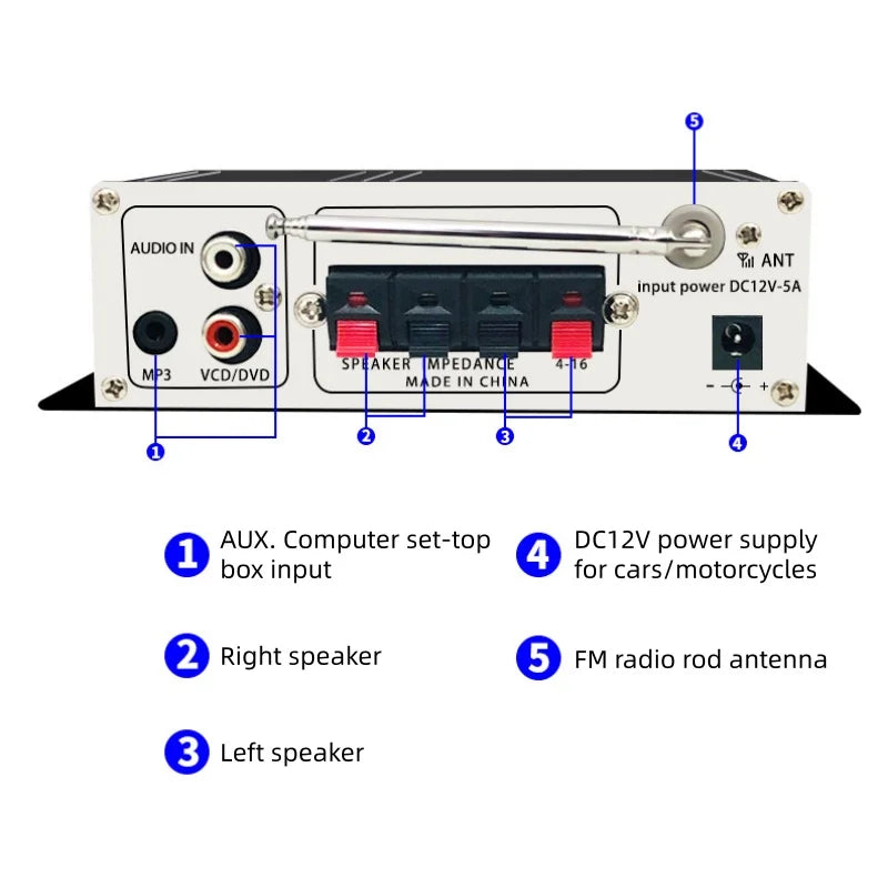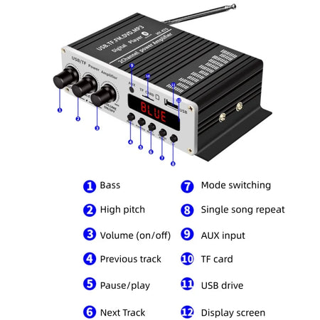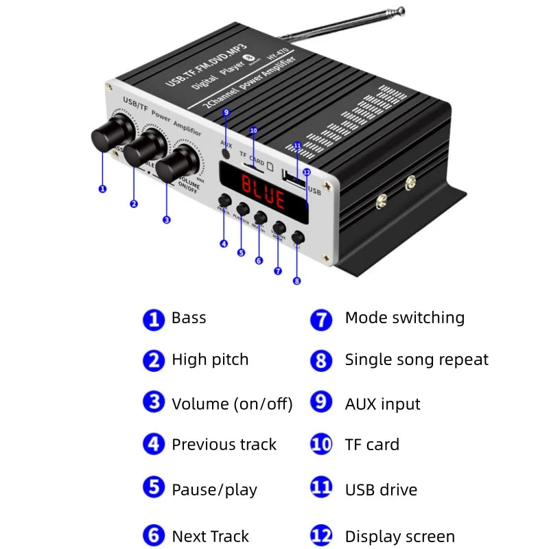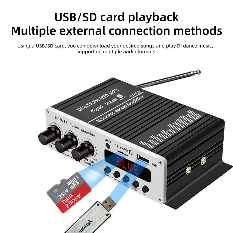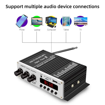 Vylepšete audio ve svém autě s KUERL HY-470BT automobilovým zesilovačem, elegantní jednotkou vyrobenou z hliníkové skořepiny pro prémiový, lehký pocit, který stále skvěle vypadá na jakémkoli palubní desce. Tento zesilovač s výkonem 20W-120W poskytuje jasný, pohlcující stereo zvuk na reproduktorech 4–8 ohmů, přetvářející každodenní melodie na živý poslechový zážitek. Bluetooth 5.0 umožňuje stabilní bezdrátové streamování z vašeho telefonu nebo tabletu až do vzdálenosti 10 metrů, takže můžete mít ruce na volantu, zatímco si užíváte své oblíbené skladby. Vestavěný digitální displej poskytuje přehledné informace o pracovním režimu, čase přehrávání a rádiové frekvenci pro snadnou obsluhu na cestách. HY-470BT podporuje přehrávání z USB/TF karet (MP3, APE, FLAC, WMA) a AUX/RCA stereo vstup, což vám dává více možností, jak přehrávat hudbu z různých zařízení. Jeho 2.0 kanálový výstup poskytuje dynamičtější stereo efekty, zatímco FM rádio (87.5–108 MHz) vás udržuje naladěné na vaše oblíbené stanice. Infračervené dálkové ovládání přidává pohodlnou, řidiči přátelskou obsluhu, od přepínání skladeb po nastavení hlasitosti, aniž byste museli spouštět oči z cesty.