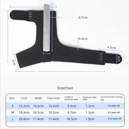 Materiál, který absorbuje pot a je prodyšný, je jemný na pokožce, takže ji můžete pohodlně nosit po delší dobu. Design s magickou pastou umožňuje snadné a bezpečné nastavení těsnosti, zatímco odnímatelný hliníkový pruh vám umožňuje přizpůsobit úhel ohybu vašim potřebám hojení. Tato dlaha je vhodná pro levou nebo pravou ruku a je k dispozici ve velikostech S, M a L, aby vyhovovala mladým uživatelům od přibližně 2 do 12 let.