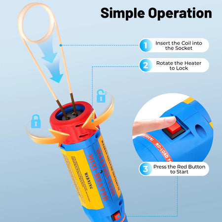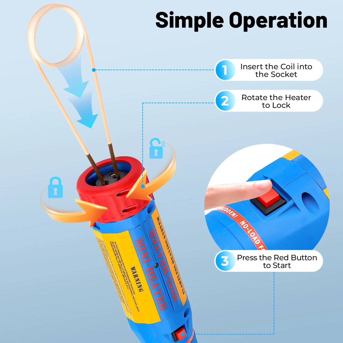Napájeno 1100W, tato sada používá pokročilou elektromagnetickou indukci k rychlému ohřevu kovu, což vám pomůže odstranit zrezivělé šrouby během několika sekund. S osmi topnými cívkami a EU-standardním napájením 220V může dosáhnout až 800°C (1472°F) za přibližně 5–40 sekund v závislosti na pracovním kusu.