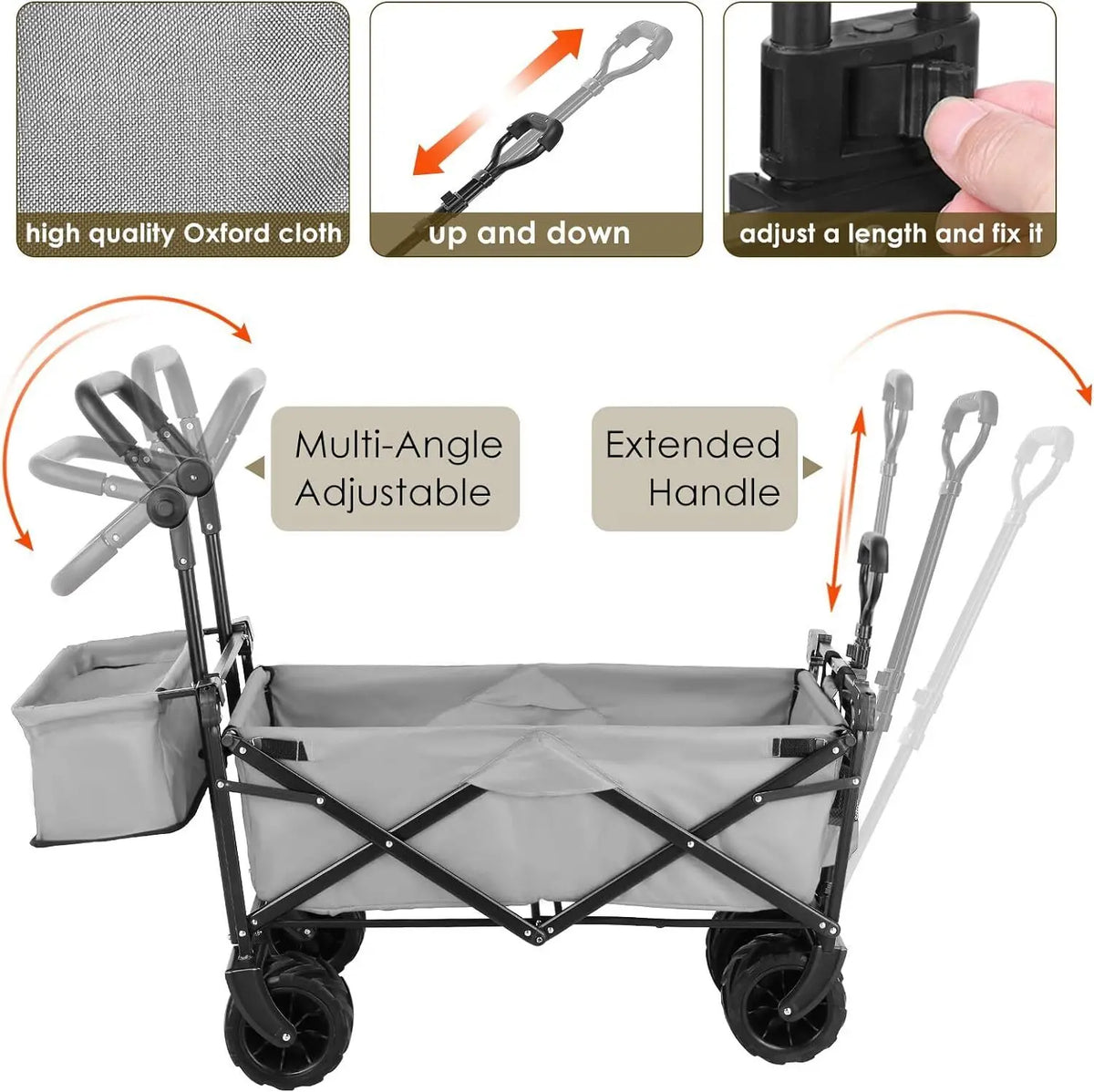 Navrženo pro snadnou přepravu, vozík má nastavitelné rukojeti pro pohodlné tlačení nebo tahání. Velká plastová kola o průměru 8 palců hladce jezdí po chodníku, trávě nebo písku, a 360° otáčení vám pomáhá snadno manévrovat v těsných místech. K dispozici jsou barvy jako modrá, červená, černá, šedá a maskáčová, takže si můžete vybrat styl, který vyhovuje vašemu venkovnímu uspořádání. Stříšku lze složit a uložit do vyhrazené kapsy pro pohodlné nastavení při dalším použití.