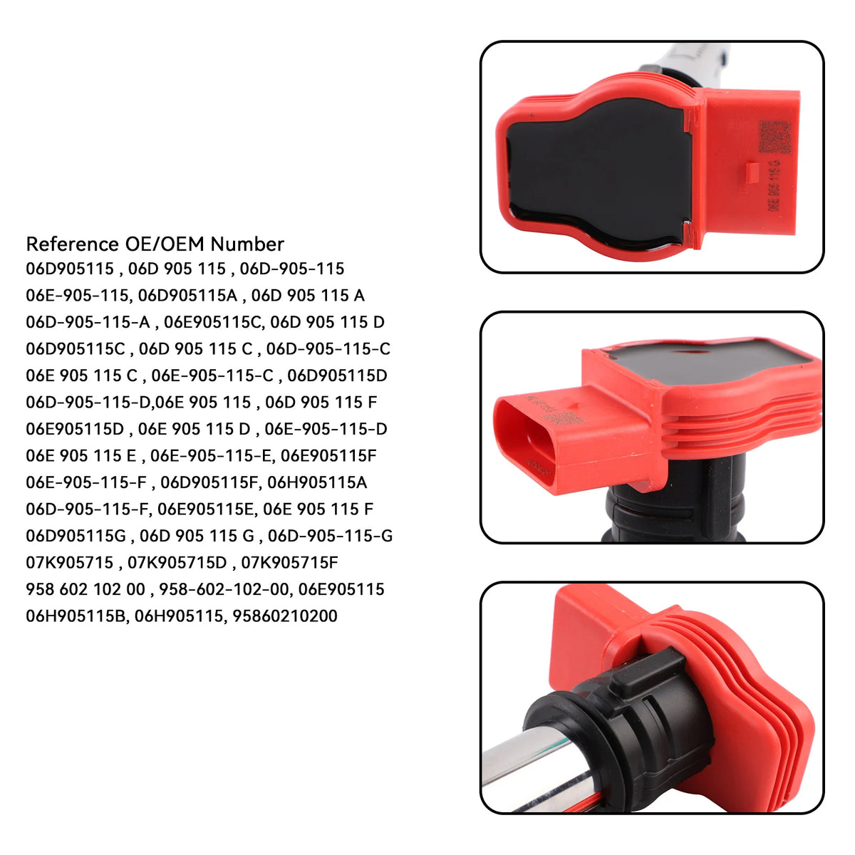 Upozornění/Připomínky: Zajistěte kompatibilitu s OE čísly 06E 905 115 G a jeho variantami (A–F) nebo 06D 905 115 A/C/D/F/G/J. Před instalací odpojte baterii vozidla a dodržujte správné bezpečnostní postupy. Pokud si nejste jisti instalací, obraťte se na kvalifikovaného mechanika, abyste se vyhnuli poškození zapalovacího systému.